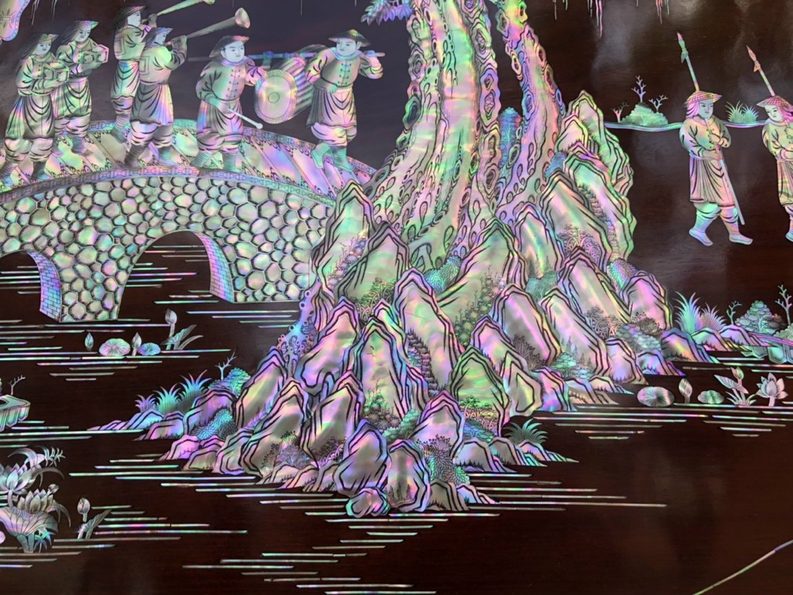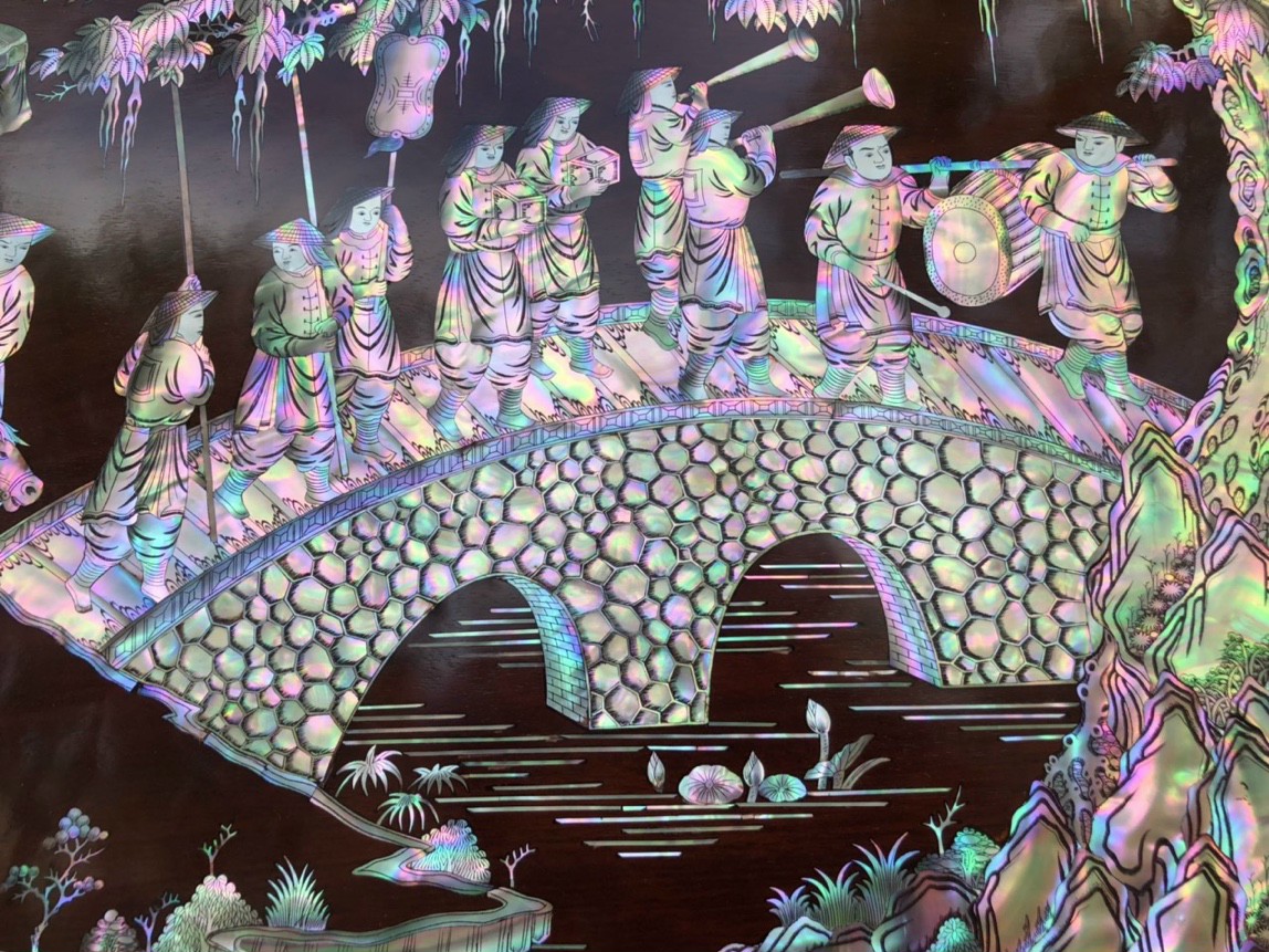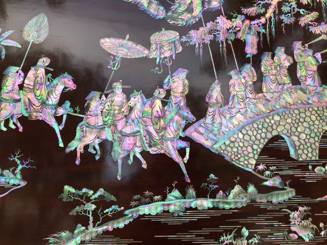 _ Tranh vinh quy bái tổ được cắt tỉa từng chi tiết xà cừ ốc đỏ ,lặp ghép vào với nhau vô cùng công phu, tinh sảo ,kỳ công .Đi hầu hết tất cả mọi đường nét đều được gọt tỉa chỉnh sửa hoàn toàn bằng tay thủ công .Đồng thời ván tấm gỗ gụ được kiểm định kỹ lưỡng như cho vào tắm nước vôi ,rồi cho vào sấy gỗ khô kiệt ,Mục đích trống dập nứt vênh mo ,mối mọt ,Kết hợp với trà nhám đánh ,giấy giáp nhiều lần ,sờ mát lạnh ,song rồi nhuộm mầu mận chín đánh vétly làm mầu mận chín giả cổ ,Tranh vinh quy được làm và hoàn thiện do bàn tay khối óc tài hoa ,Từ những người thợ giàu kinh nghiệm ,cũng như các nghệ nhân có tay nghề cao trong làng nghề truyền thống .Chính vì thế tranh vinh quy bái tổ đã đáp ứng đầy đủ những tiêu trí ( Đẹp bền rẻ ) Thẩm mỹ nghệ thuật với chất lượng hoàn hảo