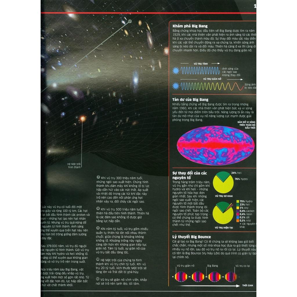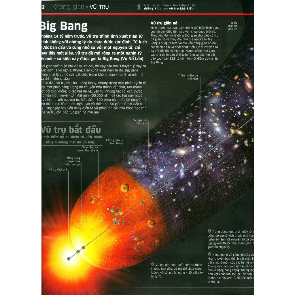 Mua tại TiktokTri Thức Về Vạn Vật - Một Thế Giới Trực Quan Chưa Từng Thấy Cuốn sách gồm 6 chương sẽ mang đến cho bạn đọc những trải nghiệm thú vị bao gồm: KHÔNG GIAN – KHÁM PHÁ KHÔNG GIAN VŨ TRỤ BAO LA Du hành và khám phá bí ẩn của vũ trụ từ vụ nổ BigBang tới sự hình thành của các thiên hà, từ sự ra đời đến cái chết của một ngôi sao như thế nào, cùng tìm hiểu hệ mặt trời và các hoạt động nghiên cứu thiên văn khác. Cuốn sách mang đến kiến thức nền tảng và trải nghiệm chân thực như một nhà du hành qua những hình ảnh đồ họa sắc nét, chú thích rõ ràng cụ thể. TRÁI ĐẤT – KHÁM PHÁ NHỮNG TRI THỨC VỀ TRÁI ĐẤT TỪ TẬN LÕI SÂU Cùng bạn rong ruổi cùng trời cuối đất, khám phá hành tinh xanh từ cấu trúc lõi trái đất gồm những tầng nào đến các mảng kiến tạo trên bề mặt địa c.ầu, hiểu về các hiện tượng tự nhiên như Bão, núi lửa phun trào, động đất đến giải đáp các bí ẩn đại dương… TỰ NHIÊN – TRẢI NGHIỆM NHƯ NHỮNG NHÀ TỰ NHIÊN HỌC Giải đáp câu hỏi quá trình tiến hóa của các giống loài từ 3,8 tỷ năm trước cho đến hiện tại. Tìm hiểu sự sống khắp hành tinh, từ những đỉnh núi cao nhất đến vực thẳm sâu nhất dưới lòng đại dương. CƠ THỂ NGƯỜI – TRẢI NGHIỆM NHƯ NHÀ GIẢI PHẪU HỌC Cơ thể người là một cỗ máy phức tạp kỳ diệu, được hình thành từ hàng triệu phần khác nhau. Cuốn sách sẽ giúp bạn tìm hiểu từ cấu trúc của một tế bào nhỏ bé đến cơ thể người bình thường, qua đó hiểu được cách thức hoạt động, cấu tạo cơ thể. KHOA HỌC – TRẢI NGHIỆM NHƯ NHÀ KHOA HỌC Cuốn sách giải thích những quy luật ngầm – nguyên lý hoạt động chi phối sự vận hành của vạn vật, từ nguyên tử và ánh sáng cho tới lực hấp dẫn và từ trường. Nhờ đó khơi nguồn cảm hứng của chúng ta để tạo ra nhiều loại máy móc và công nghệ ngày càng hiện đại hơn. LỊCH SỬ - KHÁM PHÁ NHƯ NHÀ SỬ HỌC Cuốn sách tái hiện những câu chuyện lịch sử của nhân loại, từ cuộc chiến tranh cổ đại đến những tai họa kinh khủng dẫn tới dân tộc diệt vong. Cuốn sách cũng nghiên cứu các thành tựu tiến bộ của loài người về văn hóa – công nghệ từ thời đồ đá đến hiện nay.