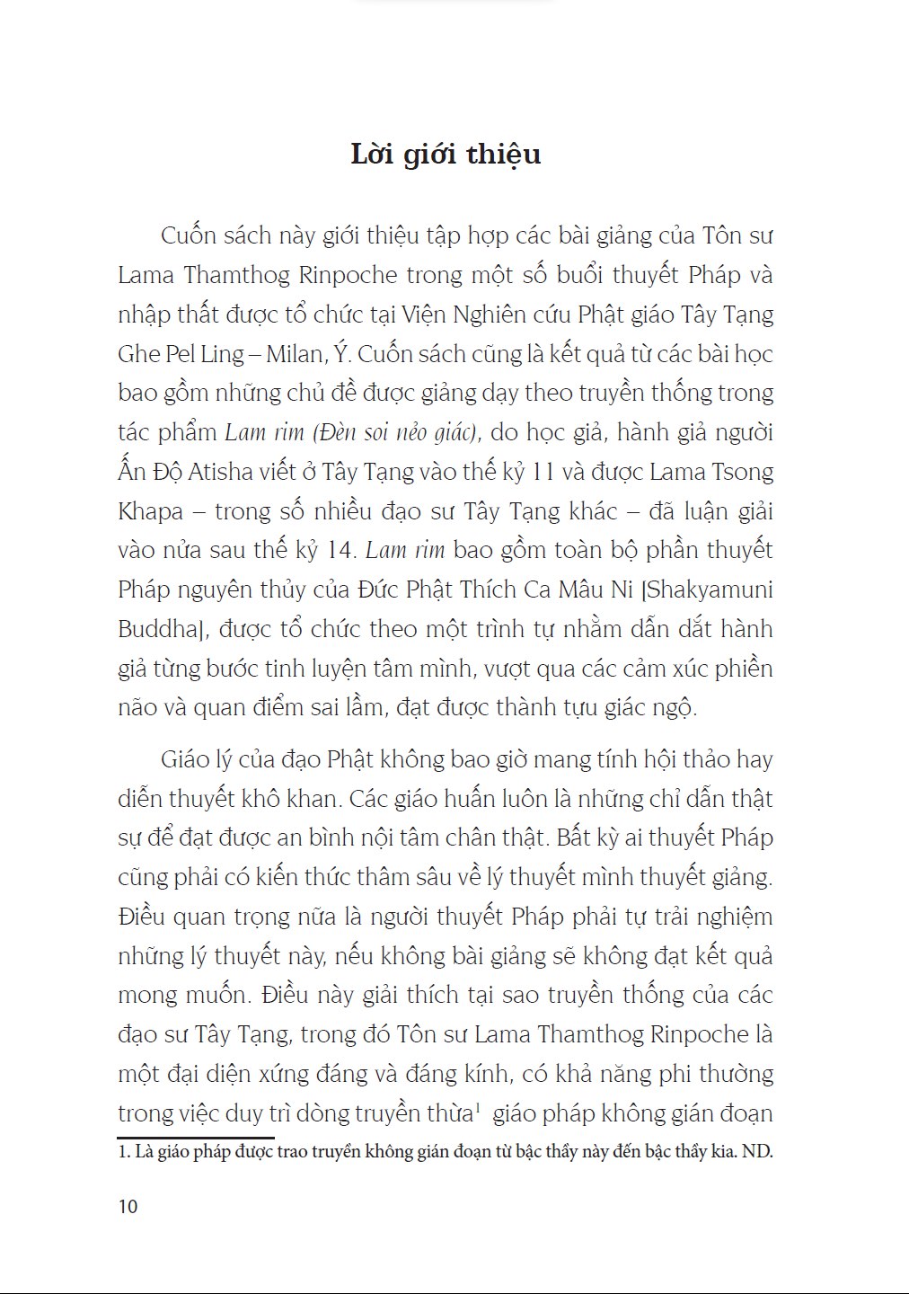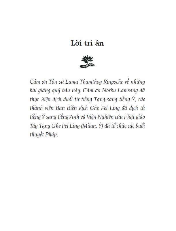 Cuốn sách giới thiệu tập hợp các bài giảng của Tôn sư Lama Thamthog Rinpoche trong một số buổi thuyết Pháp và nhập thất tổ chức tại Viện Nghiên cứu Phật giáo Tây Tạng Ghe Pel Ling ở Milan, Ý. Cuốn sách này là kết quả từ các bài học bao gồm những chủ đề được dạy theo truyền thống trong tác phẩm Lam rim (Đèn soi nẻo giác), do học giả, hành giả người Ấn Độ Atisha viết ở Tây Tạng vào thế kỉ 11 và được Lama Tsong Khapa- một trong số nhiều đạo sư Tây Tạng – luận giải vào nửa sau thế kỉ 14. Lam rim bao gồm toàn bộ phần thuyết Pháp nguyên thuỷ của Đức Phật Thích Ca Mâu Ni, được tổ chức theo một trình tự nhằm dẫn dắt thiền giả từng bước tinh luyện tâm mình, vượt qua các cảm xúc phiền não và quan điểm sai lầm, đạt được thành tựu giác ngộ.