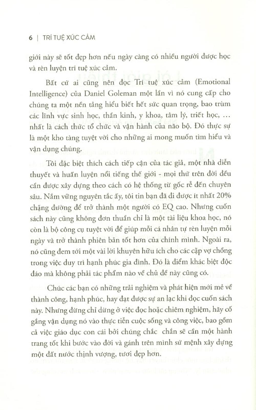 Ai cũng biết điểm IQ cao chưa chắc đã đảm bảo cho một cuộc đời thành công, hạnh phúc và đức hạnh. Nhưng chỉ đến khi đọc Trí Tuệ Xúc Cảm (Emotional Intelligence) của Daniel Goleman, chúng ta mới có thể lý giải tại sao. Dựa trên những quan sát và nghiên cứu nhiều năm trong lĩnh vực tâm lý và khoa học thần kinh, tác giả đã mang đến một cái nhìn mới mẻ về hai loại trí tuệ bên trong mỗi con người - lý trí và cảm xúc - cùng cách mà chúng định hình số phận của chúng ta.