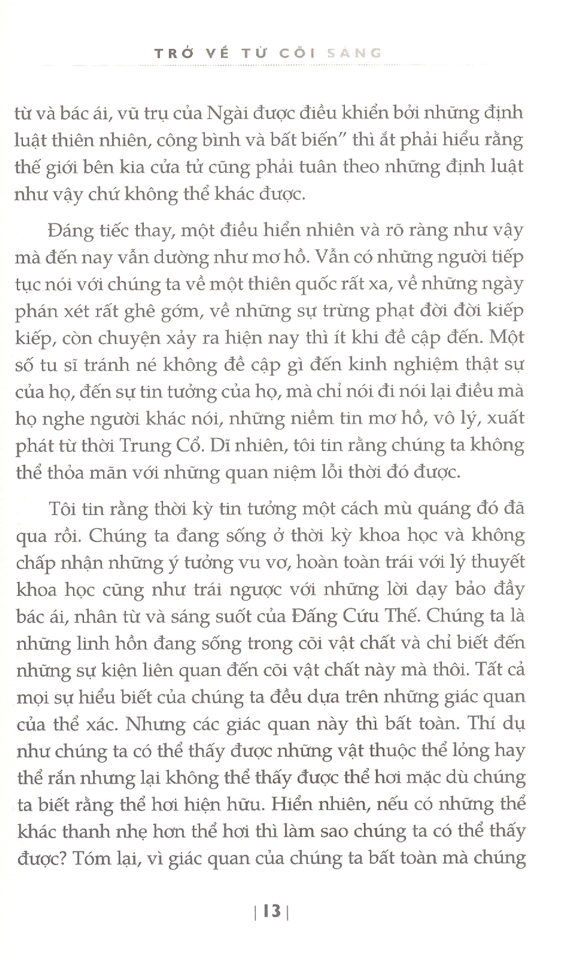 Dân gian có câu “chết chưa phải là hết”, nhưng lại chưa có những lời minh giải cho câu nói ấy, vì thế người người không hiểu được thực chất của cụm từ “chưa phải là hết”. Nếu chúng ta ai cũng hiểu biết tường tận về sự chết thì chết không phải là vấn đề đáng sợ nữa. Những chuyện có thật trong Trở Về Từ Cõi Sáng do Giáo sư Nguyên Phong biên soạn và dịch thuật, sẽ hé mở cánh cửa huyền bí tiết lộ cho bạn đọc vài điều bí mật về bên kia cửa tử. Một trong những bộ sách đặc biệt của Tây Tạng là bộ Tử Thư (Tibetian Book of the Death) viết về đời sống sau khi chết. Cuốn sách đã được nhiều người nghiên cứu và dịch thuật, nhưng vì nó quá hàm súc, khó hiểu nên một số học giả đã rút tỉa vài đoạn trong đó, khai triển rộng ra để an ủi những người đang đau khổ vì cảnh tử biệt.