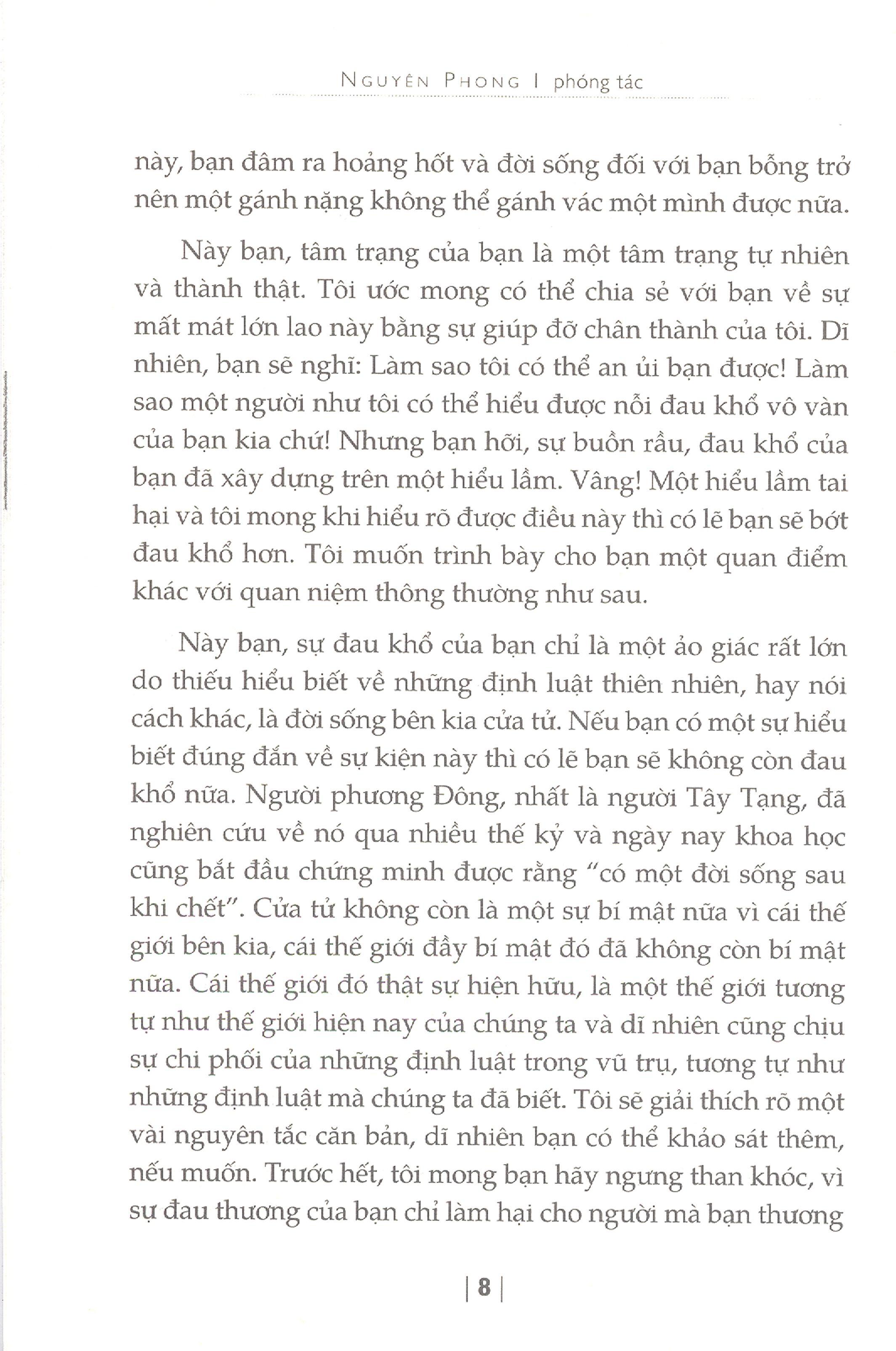 Cuốn sách “Trở Về Từ Cõi Sáng” do Nguyên Phong dịch, gồm nhiều câu chuyện của những người đã được trải nghiệm khoảnh khắc bước qua cửa tử rồi nhờ một phép màu nào đó được quay lại sự sống. Họ thấy gì ở bên kia cửa tử? Làm thế nào để khi chết không đau khổ? Những cách để giúp người mới qua đời; Khi rời thể xác linh hồn nhẹ nhàng như bay. Embraced by the Light (Trở Về Từ Cõi Sáng) của bà Betty Eadie, được Nguyên Phong giới thiệu: Xuất bản đầu năm 1992, nó đã trở nên một "Best Seller" với số bản kỷ lục và dẫn đầu những cuốn sách bán chạy nhất Hoa Kỳ. Bắt đầu từ tháng 2/1994, nó trở nên cuốn sách bán chạy nhất thế giới với 18 ấn bản bằng các thứ tiếng khác nhau.