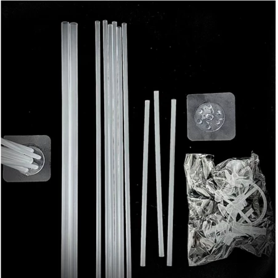 Bộ trụ bao gồm: 1 đế và 7 cây nhựa trong 1. Đế đĩa nhựa mika trong đường kính 25cm 2. Cây nhựa trong dài 70cm: 1 cây 3. Cây nhựa trong dài 60cm: 3 cây 4. Cây nhựa trong dài 40cm: 3 cây