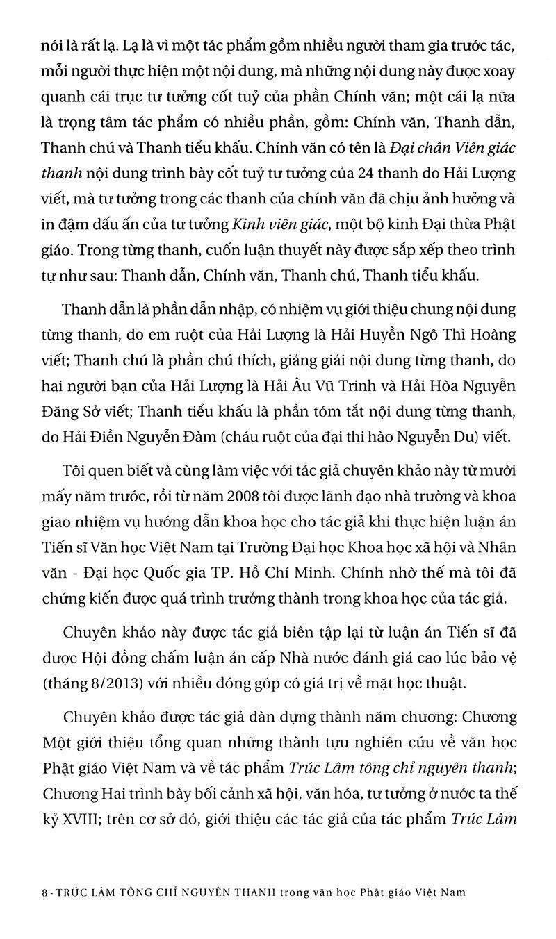 Chuyên khảo được tác giả dàn dựng thành năm chương: Chương Một giới thiệu tổng quan những thành tựu nghiên cứu về văn học Phật giáo Việt Nam và về tác phẩm Trúc Lâm tông chỉ nguyên thanh; Chương Hai trình bày bối cảnh xã hội, văn hóa, tư tưởng ở nước ta thế kỷ XVIII; trên cơ sở đó, giới thiệu các tác giả của tác phẩm Trúc Lâm tông chỉ nguyên thanh, cũng như tìm hiểu quá trình hình thành văn bản. Chương Ba và Chương Bốn là hai chương trọng tâm của công trình. Chương Ba tìm hiểu giá trị nội dung tư tưởng của tác phẩm; Chương Bốn tìm hiểu giá trị hình thức nghệ thuật của tác phẩm; Chương Năm chỉ ra vị trí và đóng góp của tác phẩm trong lịch sử tư tưởng Phật giáo Việt Nam, cụ thể là dấu ấn của Kinh viên giác trong tác phẩm; sự kế thừa và phát triển tư tưởng Thiền phái Trúc Lâm đời Trần và vị trí của tác phẩm trong bộ phận văn học Phật giáo Việt Nam thời trung đại. Một kết cấu như thế là rất chặt chẽ và khoa học, khó có thể dàn dựng một kết cấu nào khác tốt hơn.