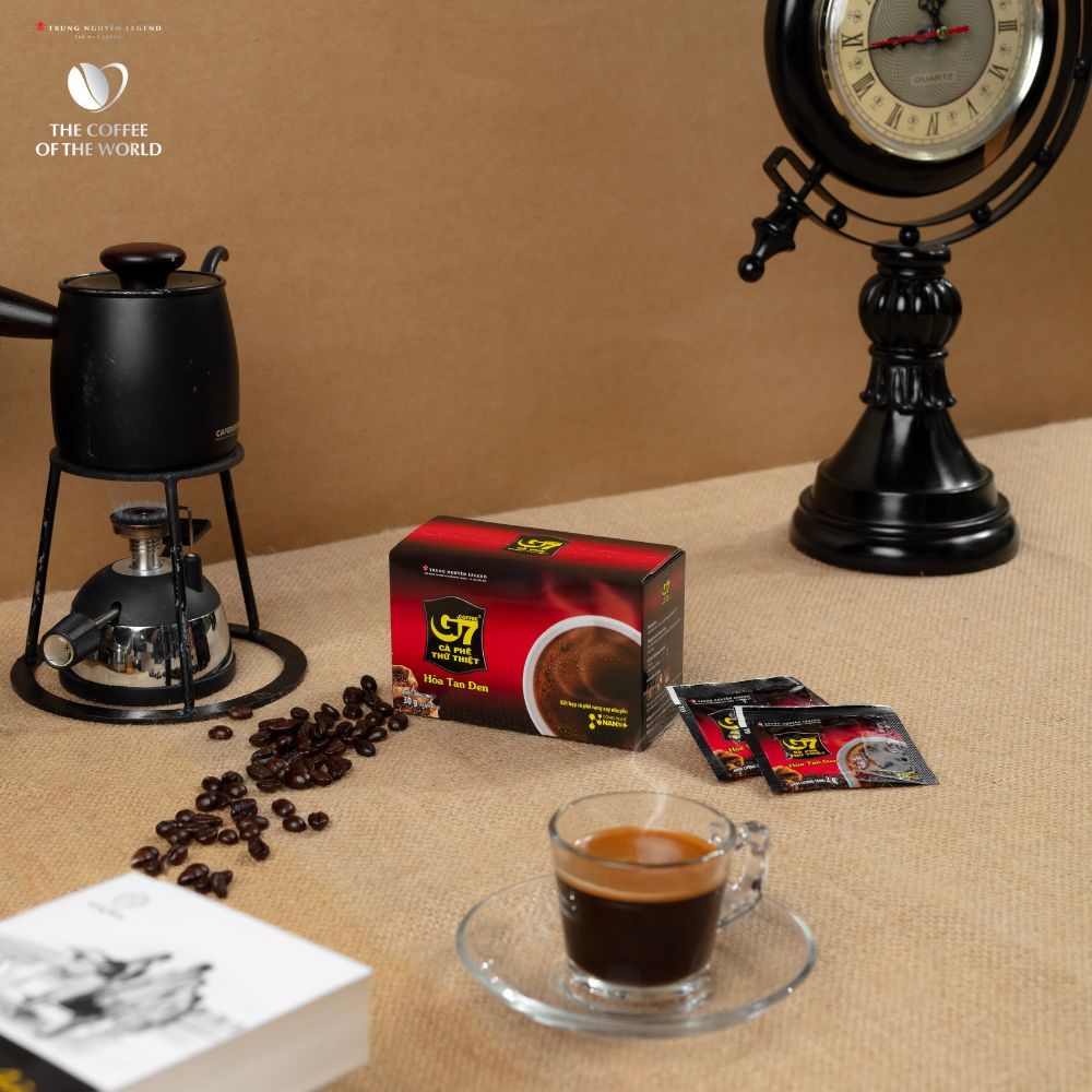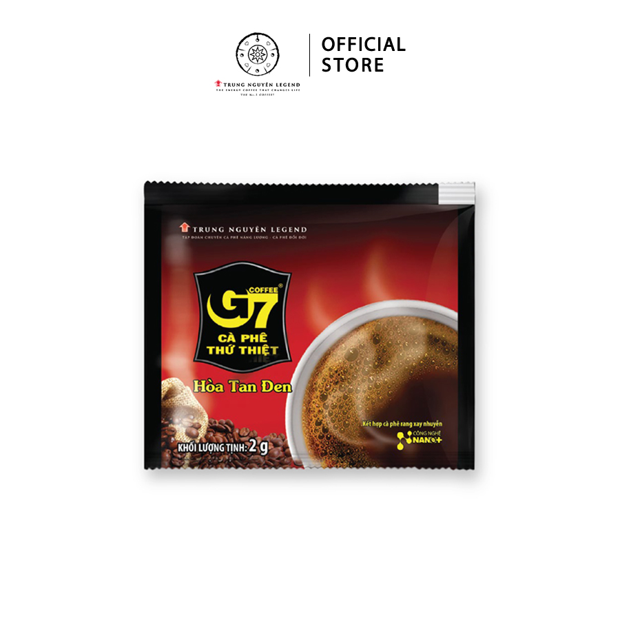 - Cà phê G7 hòa tan đen là dòng sản phẩm cà phê hòa tan đen thuần túy không đường, có chất lượng và hương vị đậm đà, thơm ngon đúng gu thưởng thức của những người sành cà phê.