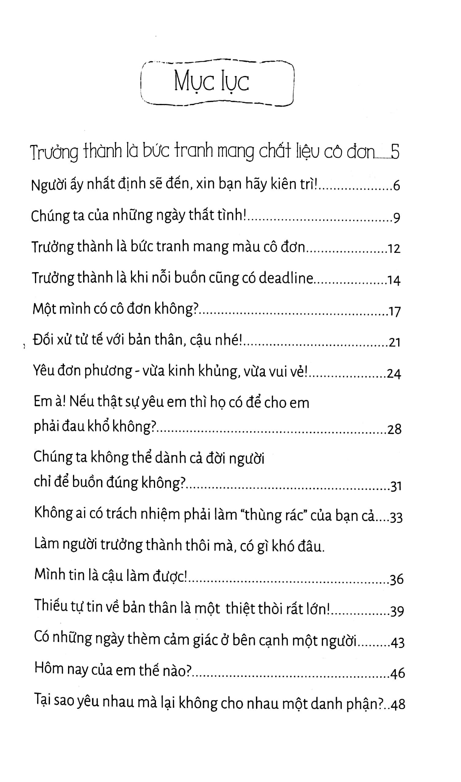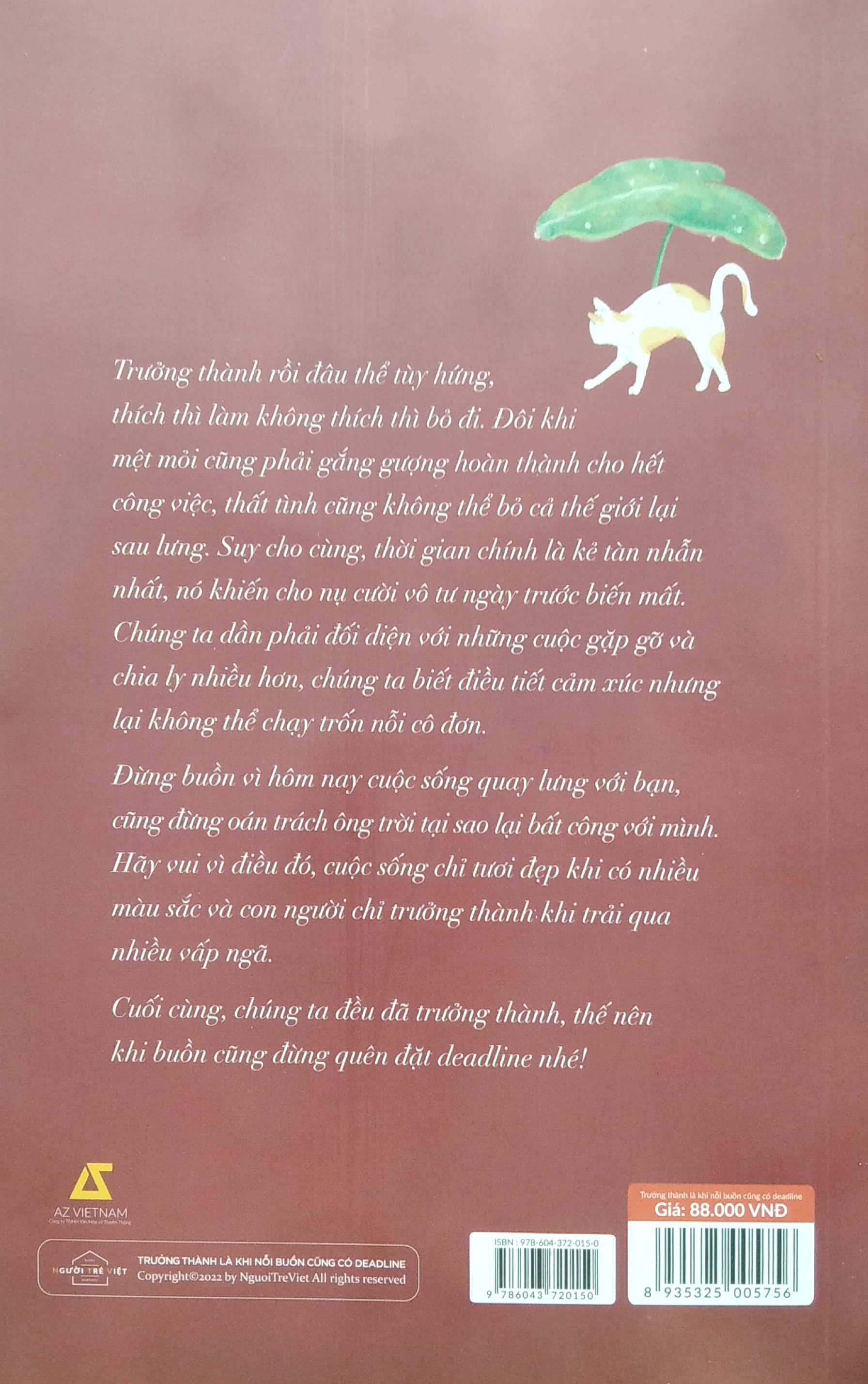 Trưởng Thành Là Khi Nỗi Buồn Cũng Có Deadline Ngày trước cứ nghĩ rằng lớn lên sẽ thích lắm, muốn làm gì cũng được, không ai quản. Đúng là như vậy, nhưng cái giá phải trả chính là sự cô đơn. Ngày trước lúc còn vô tư, thơ ngây luôn mộng tưởng cuộc sống trải đầy hoa hồng nhưng những điều hoa mỹ đó đều được sách vở “mài giũa” một cách khéo léo. Ngày trước có thể tuỳ hứng, thích thì làm không thích thì bỏ đi. Nhưng bây giờ, mệt cũng phải gắng gượng hoàn thành cho hết công việc, thất tình cũng không thể bỏ cả thế giới lại sau lưng. Sự trưởng thành ập đến mà không báo trước, tựa cơn mưa ồ ạt đổ ngang, xối xả ồn ào, mãnh liệt gột trôi mọi nét ngây thơ non nớt của mỗi người. Buộc chúng ta phải mang một chiếc ô nhỏ chống đỡ cơn mưa, mang một cái mũ rộng vành che đi giọt nắng gay gắt. Nhưng dù có che chắn tốt đến đâu, vẫn ướt bởi những giọt mưa, vẫn để lại những vết sạm do nắng đi qua. Nếu cuộc sống cho bạn mấy “cú vả nhớ đời” làm bạn mất thăng bằng, muốn buông xuôi tất cả và bỏ rơi bản thân mình thì hãy nhớ rằng: Trưởng thành ấy mà, ai cũng giống nhau, đều phải trải qua những ngày mơ hồ về tương lai, những ngày mang trong mình một nỗi buồn. “Trưởng thành là khi nỗi buồn cũng có deadline” sẽ tưới mát sự cô đơn “héo mòn” từng ngày của bạn, kéo bạn phần nào thoát khỏi cuộc sống khắc nghiệt để giúp bạn nhận ra phía trước còn rất nhiều điều tốt đẹp, bạn không được từ bỏ mọi thứ dễ dàng như thế. Hy vọng bất kể ngày nắng hay mưa, dù vui hay buồn, bạn cũng có thể nở nụ cười tự nhiên nhất, khoác lên mình dáng vẻ yêu thích và trở thành phiên bản độc nhất. Và hãy ghi nhớ rằng “KHI CHÚNG TA TRƯỞNG THÀNH, ĐỪNG QUÊN ĐẶT DEADLINE CHO CẢ NỖI BUỒN”.