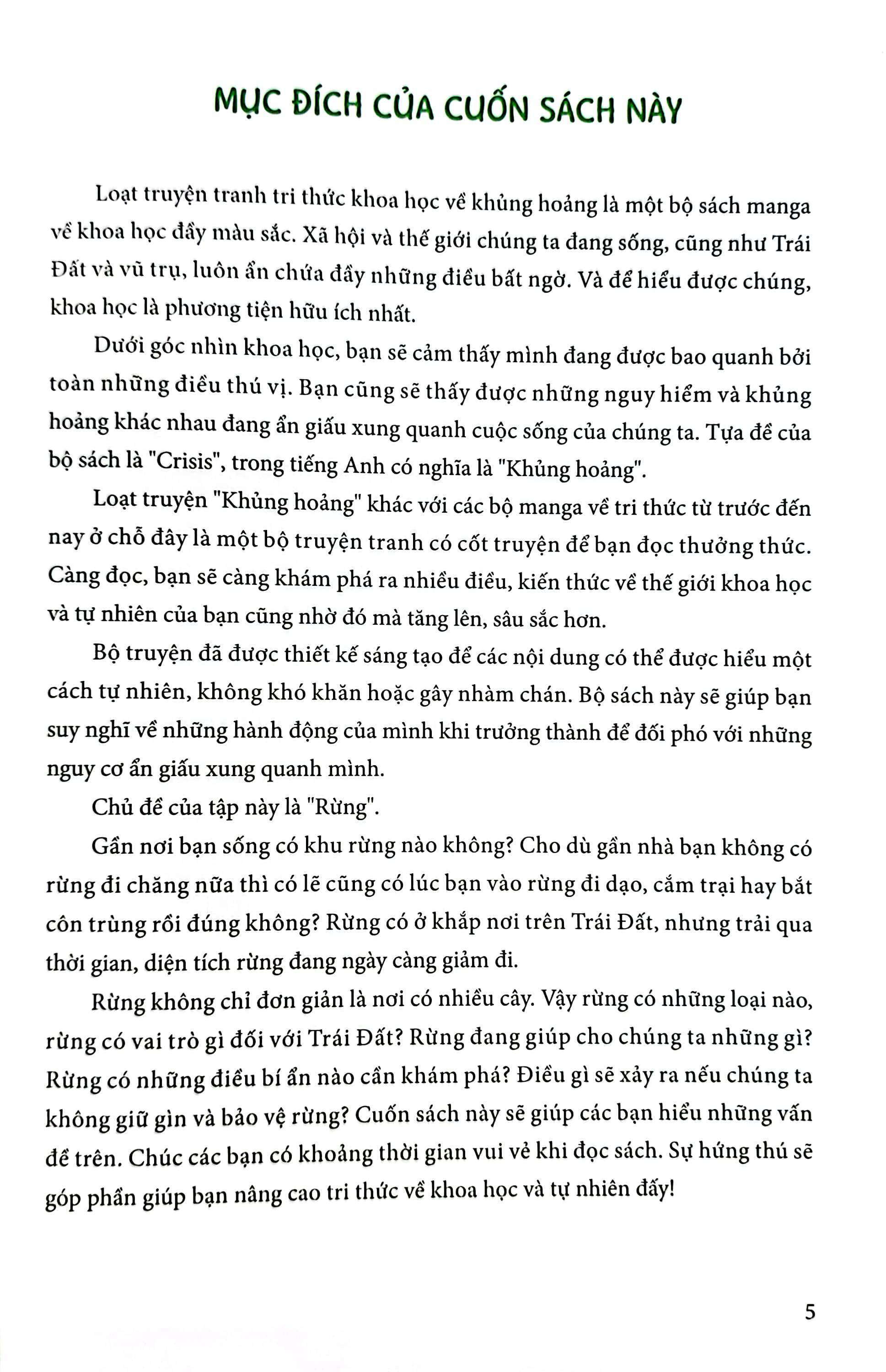 Khủng hoảng rừng là một trong bộ 8 sách Truyện tranh tri thức khoa học, cuốn sách với những nét vẽ minh họa sinh động sẽ đưa chúng ta tìm hiểu cụ thể về rừng và những kiến thức liên quan đến môi trường rừng, lá phổi của Trái Đất.
