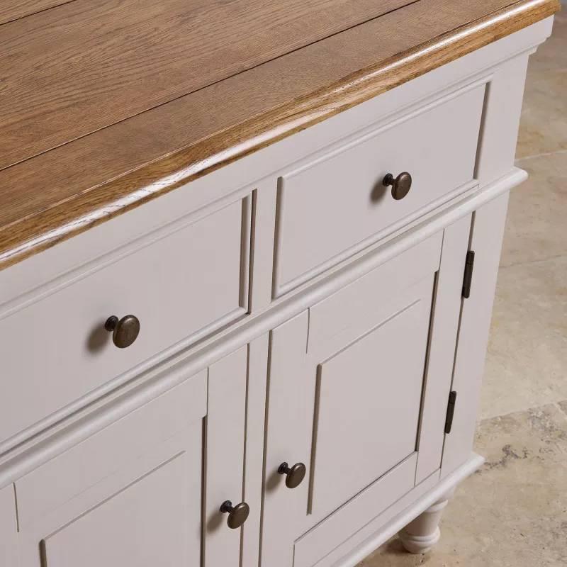 Tủ chén cao Shay loại lớn có thiết kế đa năng, mở ra không gian lưu trữ và trưng bày tiện dụng cho phòng ăn và phòng khách. Được làm từ loại gỗ sồi trắng Mỹ nhập khẩu, mang màu sắc tự nhiên ấm áp, phần thân sơn màu trắng xám nhẹ nhàng, Thiết kế mang đặc trưng của bộ sưu tập Shay hiện đại với những đường nét bo tròn mềm mại, chân thon gọn mang lại cái nhìn ấn tượng và trang trọng. Các ngăn kéo được chế tác thủ công, kết cấu chính xác, kết hợp tay nắm nhỏ gọn tiện lợi. Mặt kệ gỗ dày dặn, có khả năng chịu lực cực tốt sẽ là nơi trưng bày an toàn và đẹp mắt các đồ dùng trang trí trong nhà lâu dài theo thời gian.