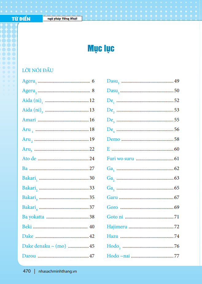 Thấu hiểu được vấn đề này chúng tôi đã dày công tìm hiểu và biên soạn cuốn giáo trình “Từ điển ngữ pháp tiếng Nhật”. Cuốn giáo trình bao gồm khoảng 300 mẫu câu từ trình độ N5 - N3. Ở mỗi cấu trúc đều có công thức kết hợp, ý nghĩa, cách sử dụng, rất nhiều ví dụ sinh động sát thực tế kèm theo, và đặc biệt ở phần chú ý chúng ta sẽ được so sánh với những biểu hiện có ý nghĩa tương tự hoặc liên quan.