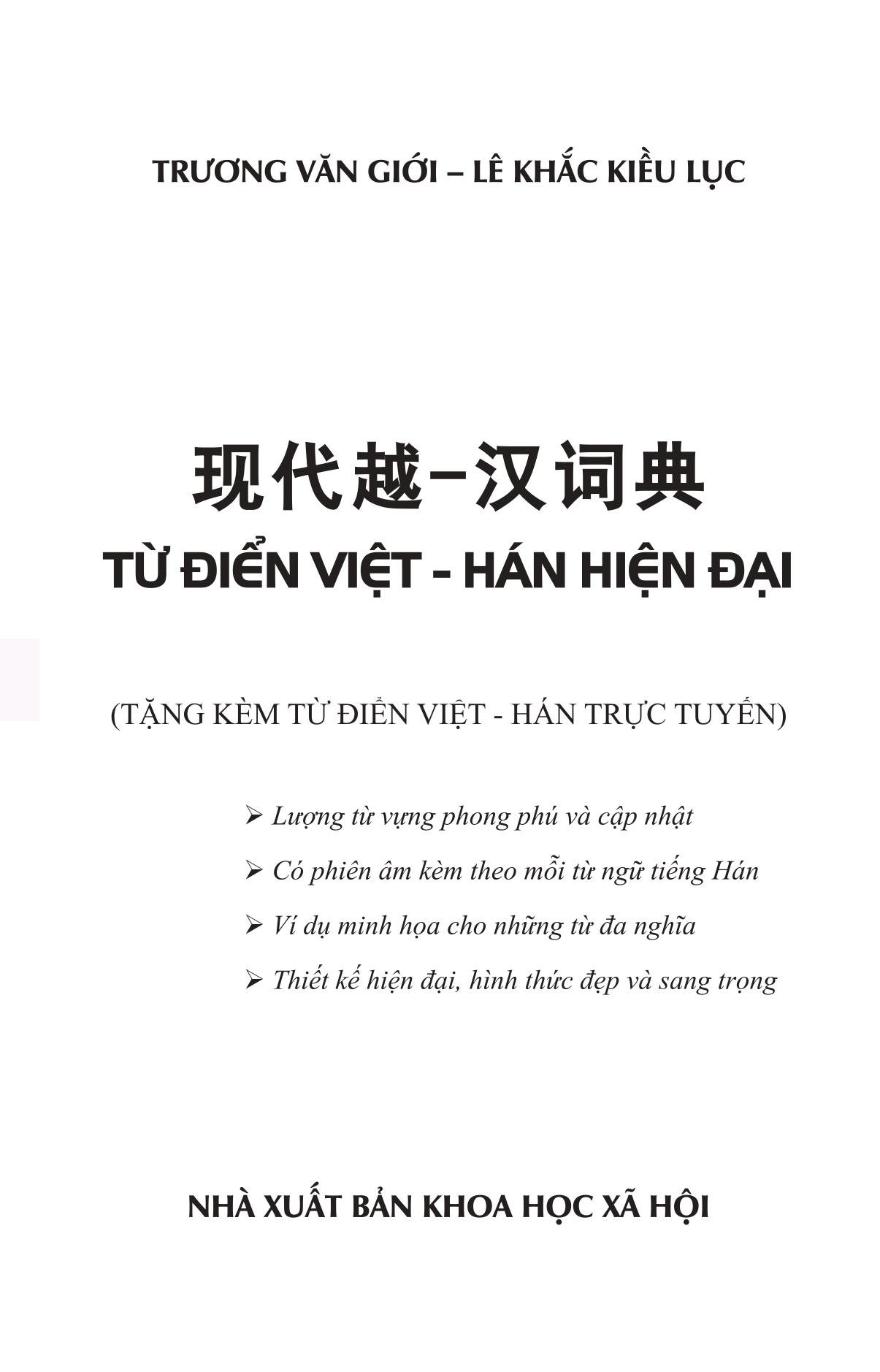 Quyển TỪ ĐIỂN VIỆT - HÁN HIỆN ĐẠI này được tái bản toàn diện từ bản in lần đầu năm 2009, là quyển sách công cụ đối chiếu ngôn ngữ Việt và Hán, nhằm giúp cho người tra cứu, đi từ nghĩa tiếng Việt, có thể tìm được từ tiếng Hán tương ứng cần dùng. Về mặt nội dung, từ điển đã được sửa chữa, bổ sung và cập nhật lớn, vì vậy từ điển có lượng từ vựng tương đối phong phú và cập nhật. Ngoài những từ ngữ cơ bản, thường dùng, từ điển còn cung cấp cho các bạn một số từ ngữ đang lưu hành hiện nay trong các lĩnh vực của đời sống xã hội, những thuật ngữ chuyên ngành kinh tế, tin học, sinh học, y học, toán học, ngôn ngữ học… Những từ đa nghĩa hầu hết đều được kèm theo ví dụ minh họa để các bạn dễ dàng phân biệt và sử dụng. Đặc biệt, với phiên âm kèm theo mỗi từ tiếng Hán, việc tra cứu của các bạn sẽ trở nên dễ dàng, thuận tiện và nhanh chóng hơn.