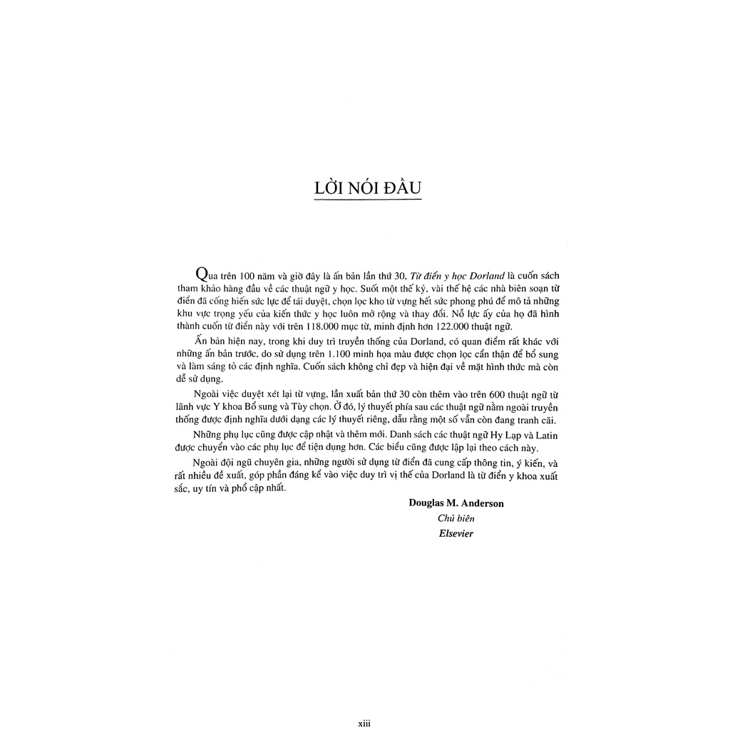 Qua trên 100 năm, Từ điển y học Dorland là cuốn sách tham khảo hàng đầu trên thế giới về các thuật ngữ y học. Nhiều thế hệ chuyên gia biên soạn từ điển đã cống hiến sức lực để tái duyệt, chọn lọc kho từ vựng hết sức phong phú mô tả những khu vực trọng yếu của kiến thức y học luôn mở rộng và thay đổi. Nỗ lực ấy của họ đã hình thành cuốn từ điển này với trên 118.000 mục từ, minh định hơn 122.000 thuật ngữ.