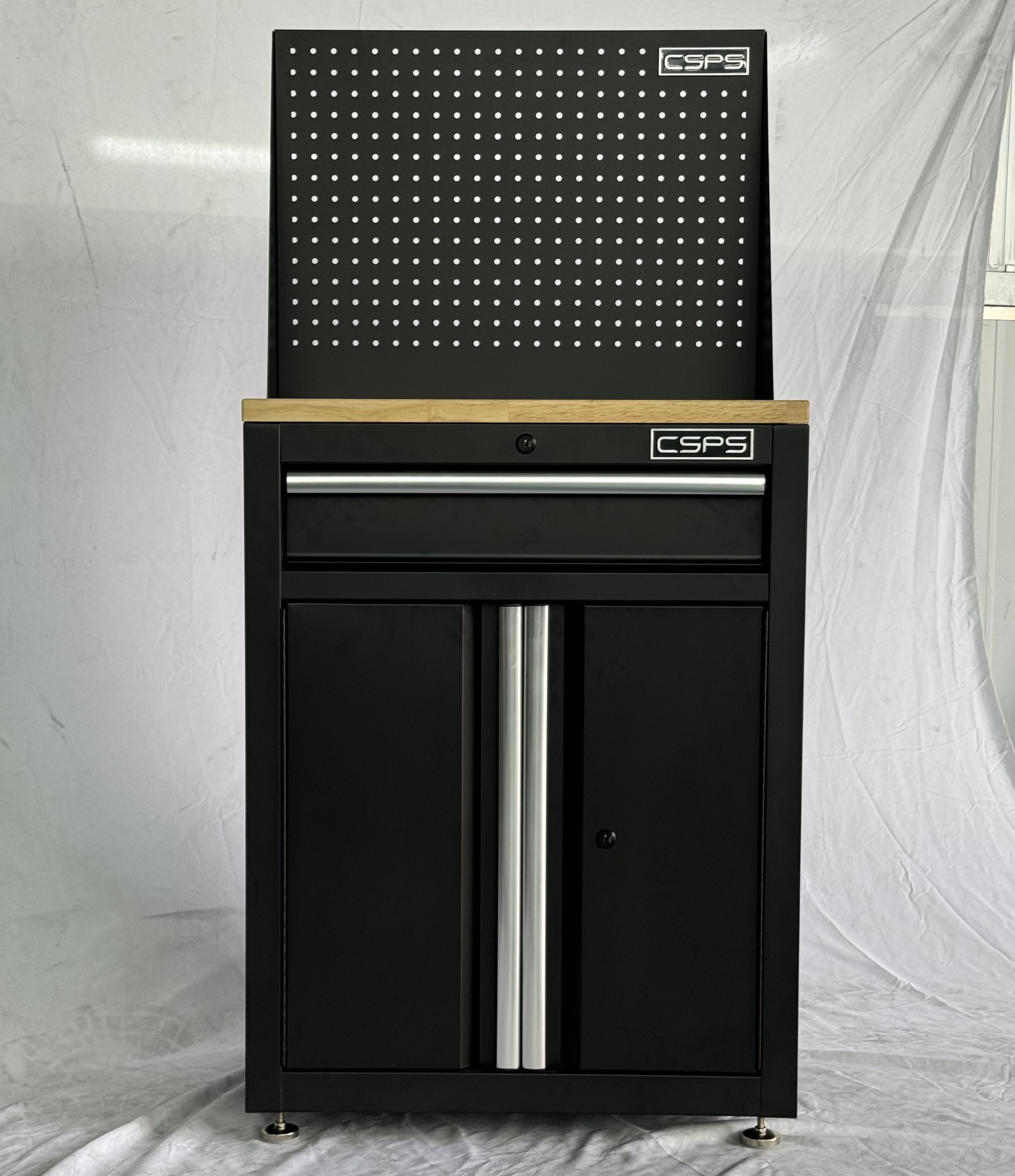 Tủ dụng cụ 61cm - 01 hộc kéo màu đen chân tăng chỉnh ván gỗ vách lưới (tay cầm trắng)