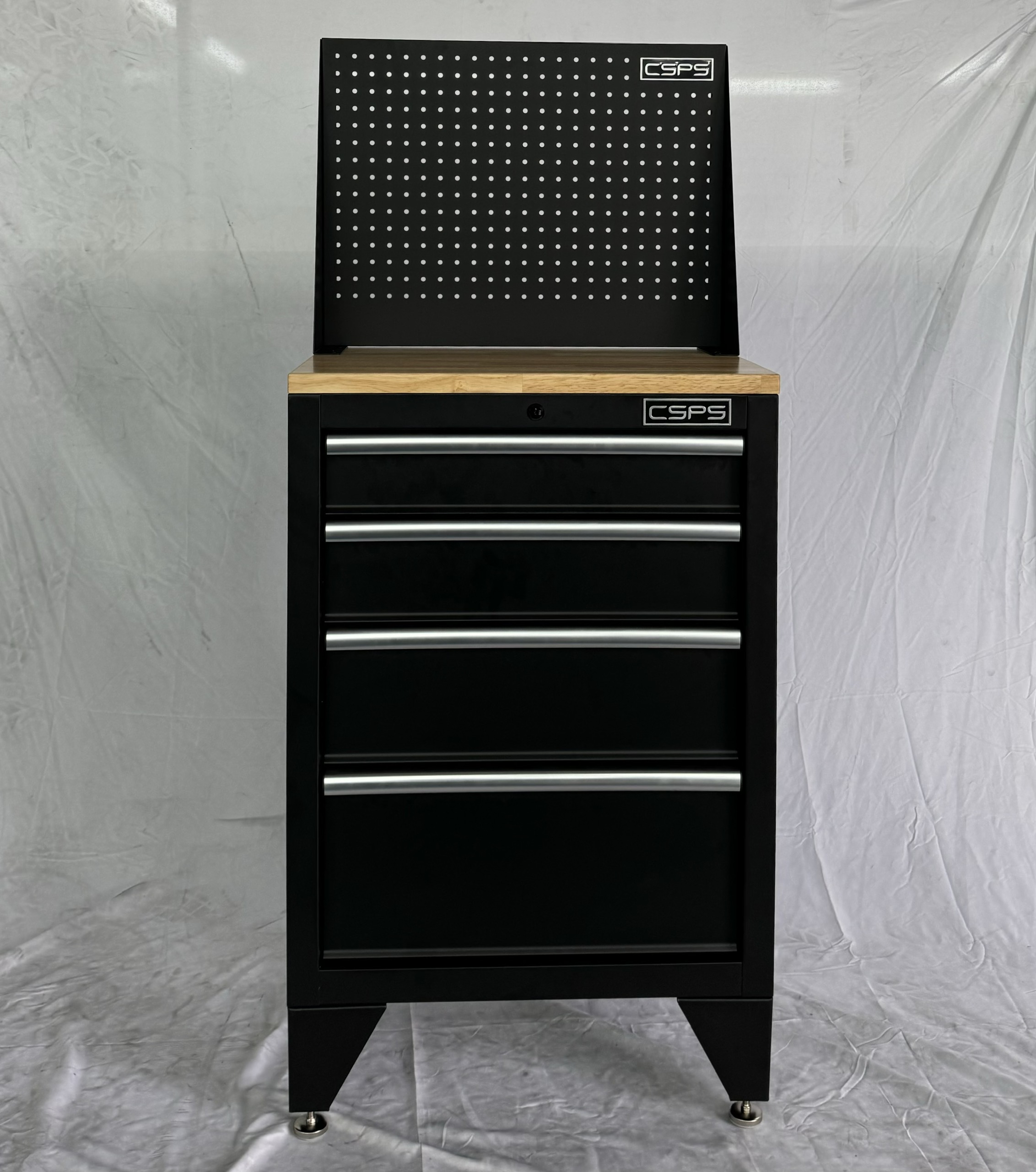 ✨Tủ dụng cụ CSPS 61cm - 04 hộc kéo màu đen chân tủ ván gỗ vách lưới (tay cầm trắng)