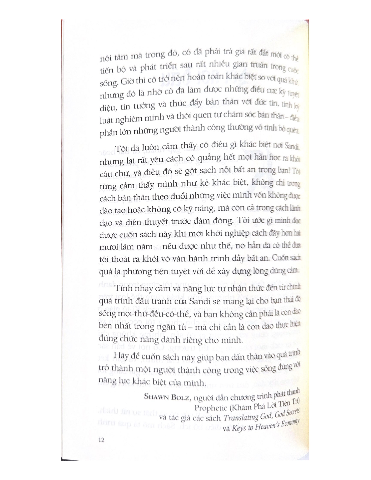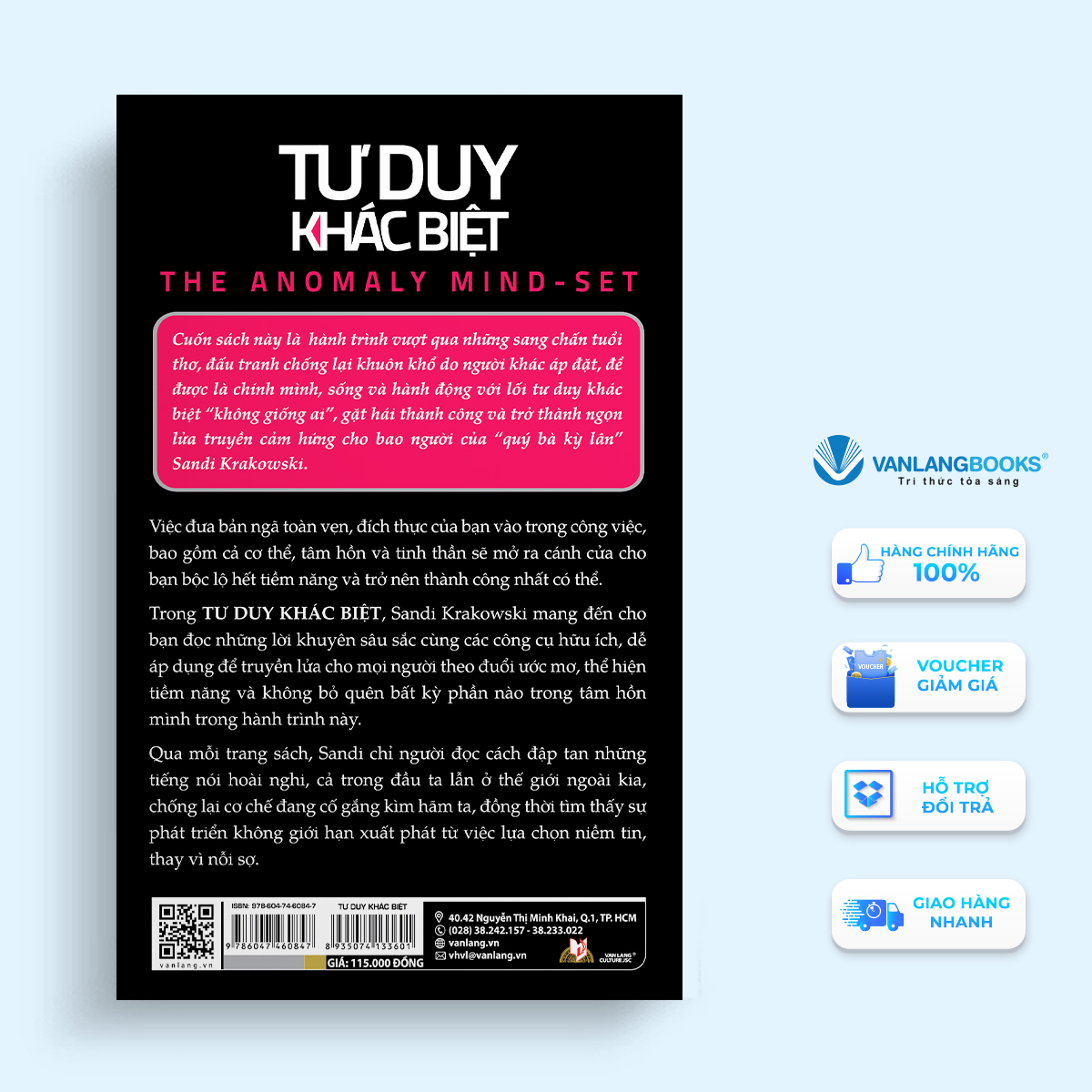- Giới thiệu Tư Duy Khác Biệt Cuốn sách này là hành trình vượt qua những sang chấn tuổi thơ, đấu tranh chống lại khuôn khổ do người khác áp đặt, để được là chính mình, sống và hành động với lối tư duy khác biệt “không giống ai”, gặt hái thành công và trở thành ngọn lửa truyền cảm hứng cho bao người của “quý bà kỳ lân” Sandi Krakowski. Việc đưa bản ngã toàn vẹn, đích thực của bạn vào trong công việc, bao gồm cả cơ thể, tâm hồn và tinh thần sẽ mở ra cánh cửa cho bạn bộc lộ hết tiềm năng và trở nên thành công nhất có thể Trong Tư Duy Khác Biệt, Sandi Krakowski mang đến cho bạn đọc những lời khuyên sâu sắc cùng các công cụ hữu ích, dễ áp dụng để truyền lửa cho mọi người theo đuổi ước mơ, thể hiện tiềm năng và không bỏ quên bất kỳ phần nào trong tâm hồn mình trong hành trình này. Qua mỗi trang sách, Sandi chỉ người đọc cách đập tan những tiếng nói hoài nghi, cả trong đầu ta lẫn ở thế giới ngoài kia, chống lại cơ chế đang cố gắng kìm hãm ta, đồng thời tìm thấy sự phát triển không giới hạn xuất phát từ việc lựa chọn niềm tin, thay vì nỗi sợ.