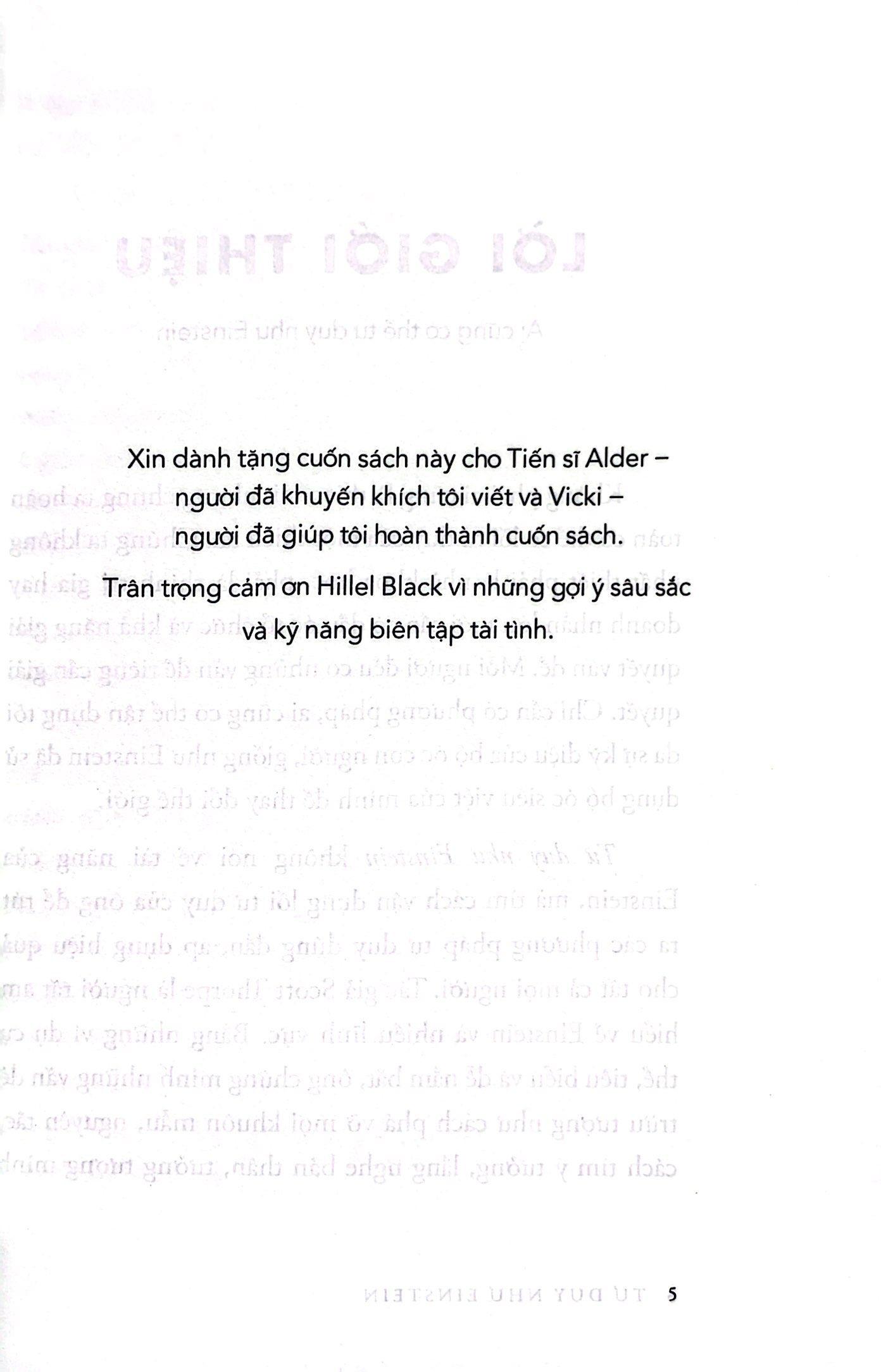 Tư duy như Einstein – cuốn sách phát triển tư duy mở ra những giải pháp đột phá để đối mặt, giải quyết mọi thách thức trong học tập, công việc, cuộc sống, các mối quan hệ, để không ngừng sáng tạo và phát triển mỗi ngày. Không phải ai cũng là thiên tài, nhưng chúng ta hoàn toàn có thể có lối tư duy của một thiên tài. Chúng ta không nhất thiết phải là nhà khoa học, không nhất thiết phải là chính trị gia hay doanh nhân lớn mới cần có đầu óc tổ chức và khả năng giải quyết vấn đề. Mỗi người đều có những vấn đề riêng cần giải quyết. Chỉ cần có phương pháp, ai cũng có thể tận dụng tối đa sự kỳ diệu của bộ óc con người, giống như Einstein đã sử dụng bộ óc siêu việt của mình để thay đổi thế giới. Và cuốn sách Tư duy như Einstein sẽ giúp bạn làm được điều đó. Tư duy như Einstein không nói về tài năng của Einstein, mà tìm cách vận dụng những lối tư duy của ông để rút ra các phương pháp tư duy đúng đắn và hiệu quả cho tất cả mọi người. Tác giả Scott Thorpe tỏ ra là người rất am hiểu về Einstein và nhiều lĩnh vực. Bằng những ví dụ cụ thể, tiêu biểu và dễ nắm bắt, ông chứng minh những vấn đề trừu tượng như cách phá vỡ mọi khuôn mẫu, nguyên tắc, tìm ý tưởng, lắng nghe bản thân, tưởng tượng mình là người khác hay sử dụng những ký hiệu, ngôn từ mới để thể hiện ý tưởng. Cuốn sách gồm 11 chương và hai phụ lục, hai chương đầu giới thiệu khái quát về Einstein và cách tư duy của ông, các chương tiếp theo đưa ra những bước đơn giản nhằm “phá vỡ nguyên tắc và khám phá khả năng thiên tài tiềm ẩn trong bạn”. Mỗi chương là một bước khám phá thông qua nhiều phương pháp và những ví dụ từ kinh điển đến thực tế giản đơn. Tư duy như Einstein là một câu chuyện, trong đó tác giả dẫn người đọc đi qua từng chặng đường với những bài thực hành độc đáo, giản dị đến mức khó tin, nhưng lại phản ánh cả một triết lý sâu sắc. Với rất nhiều loại công cụ đơn giản, bạn có thể thực hành các bài tập, nhưng quan trọng nhất vẫn là biết vận dụng chúng vào thực tế cuộc sống. Hãy nghĩ đến kết quả trước khi hành động, suy nghĩ tích cực, loại bỏ khó khăn và cản trở đến từ chính bản thân mình, thực thi những giải pháp tưởng như bất khả thi. Học cách tư duy của Einstein chính là học cách phá vỡ các nguyên tắc. Tác giả đã chứng minh rằng mọi nguyên tắc đều có thể bị phá vỡ và mục đích của việc phá vỡ nguyên tắc là để tìm ra giải pháp tối ưu. Tuy nhiên, không phải tất cả những cái mới đều hay và phù hợp, có những điều chúng ta không nên thay đổi. Từ cổ chí kim, mọi cuộc cách mạng, mọi sự thay đổi đều gian nan. Thế giới thực tại thường vận hành không như ý muốn của con người. Các sáng kiến có thể gây nguy hiểm cho người nghĩ ra chúng vì lòng tham, sự ích kỷ hoặc vì lối mòn tư duy của con người. Do đó, để có được cái mới, cái hay và cái đúng, chúng ta không những cần có phương pháp mà còn phải tỉnh táo, khéo léo để vượt qua và tránh những tai họa mà những người sáng tạo thường gặp phải. Chương 9 dành tặng độc giả những bài học tránh tai họa để thẳng tiến trên con đường phá vỡ nguyên tắc của mình. Tất cả mọi thứ đều có thể đưa đến giải pháp, hãy chú ý quan sát và lắng nghe, thậm chí lắng nghe cả kẻ thù của bạn. Đó không phải là một phép màu hay một truyện cổ tích, đó đơn giản là một phương pháp tư duy và giải quyết vấn đề.