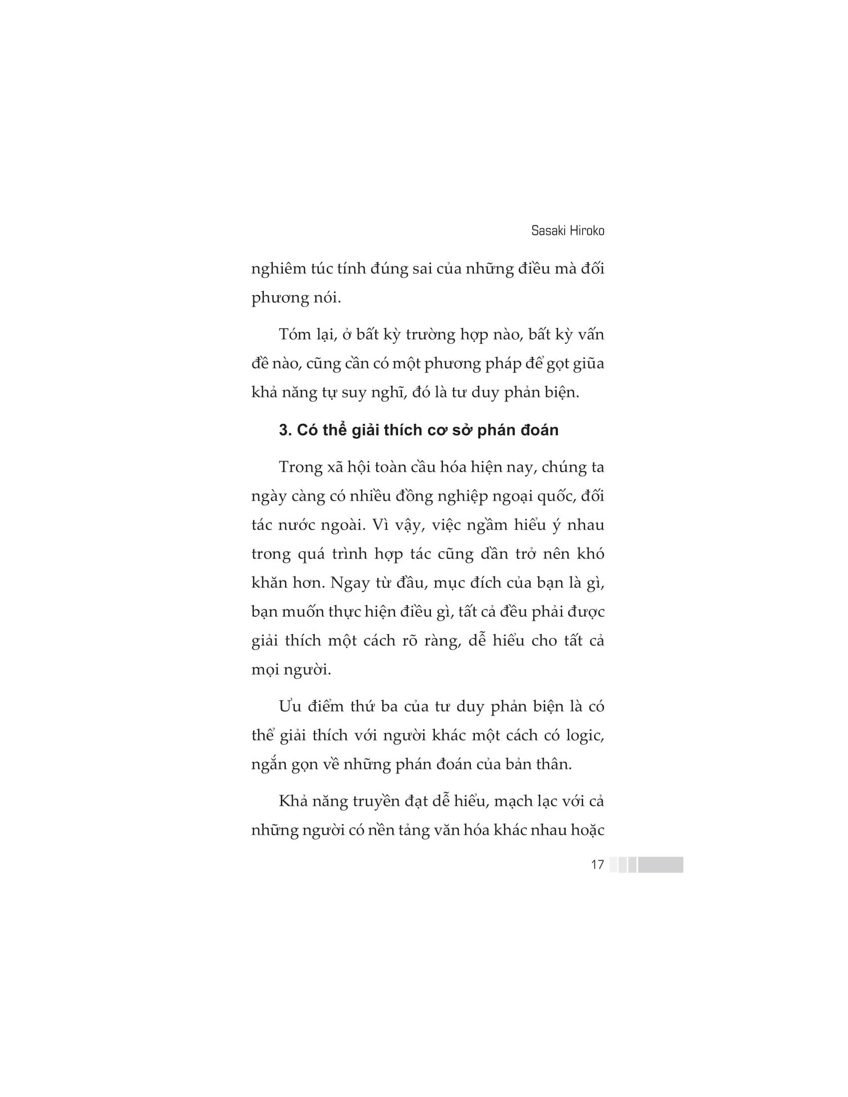 Với “ Tư duy phản biện trong công việc” sẽ trang bị cho người đọc cách tiếp cận vấn đề trên nhiều phương diện, khả năng suy nghĩ thấu đáo, thực tế và sâu sắc, tạo ra những thay đổi tích cực trong suy nghĩ và hành động trong cuộc sống lẫn công việc. Từ đó giúp bạn: