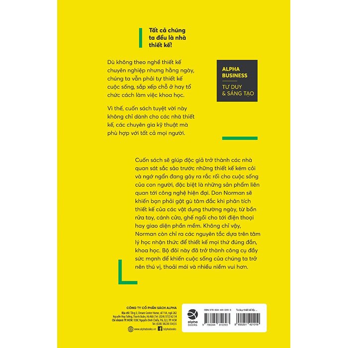 Cuốn sách sẽ giúp độc giả trở thành các nhà quan sát sắc sảo trước những thiết kế kém cỏi và ngớ ngẩn đang gây ra rắc rối cho cuộc sống của con người, đặc biệt là những sản phẩm liên quan tới công nghệ hiện đại. Don Norman sẽ khiến bạn phải gật gù tâm đắc khi phân tích thiết kế của các vật dụng thường ngày, từ bồn rửa tay, cánh cửa, ghế ngồi cho tới điện thoại hay giao diện phần mềm. Không chỉ vậy, Don Norman còn chỉ ra các nguyên tắc dựa trên tâm lý học nhận thức để thiết kế mọi thứ đúng đắn, khoa học. Bộ đôi này đã trở thành công cụ đầy sức mạnh để khiến cuộc sống của chúng ta trở nên thú vị, thoải mái và nhiều niềm vui hơn.