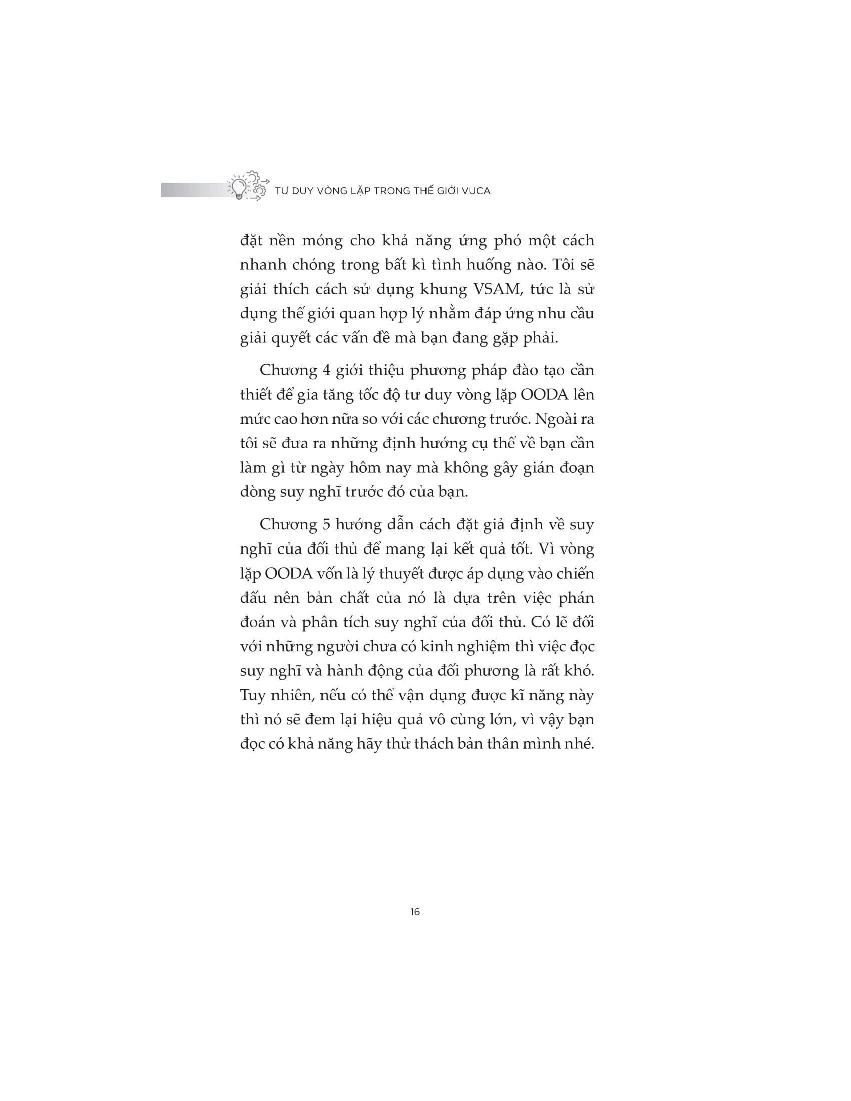 Tư Duy Vòng Lặp Trong Thế Giới VUCA Chúng ta đang sống trong một thời đại mà thông tin và tốc độ nắm quyền quyết định, cùng với sự phức tạp và khó nắm bắt của thế giới VUCA. Để có thể thích nghi và giành lợi thế trong bất kỳ môi trường nào thì tốc độ chính là yếu tố quyết định. Một trong những phương pháp tư duy ưu tiên tốc độ và tính linh hoạt hiệu quả hiện nay, đó là vòng lặp OODA. Vòng lặp OODA là một chu trình ra quyết định bao gồm: Observe (quan sát), Orient (định hướng), Decide (quyết định) và Action (hành động). Đây là quy trình phán đoán và ra quyết định được áp dụng chủ yếu trong các chiến lược quân sự và sau này là các hoạt động kinh doanh hay lãnh đạo. Với OODA, bạn sẽ giành được ưu thế tuyệt đối về tốc độ và sự linh hoạt để giải quyết các tình huống phát sinh trong công việc cũng như cuộc sống hằng ngày. Vòng lặp OODA đã được công nhận ở Âu Mỹ là phương pháp tư duy hiệu quả để đạt được mục đích nhanh chóng bằng phán đoán và ra quyết định chính xác dưới bất kỳ hoàn cảnh nào. Cuốn sách “Tư duy vòng lặp trong thế giới VUCA” hướng dẫn các “lối tắt” giúp ứng dụng vòng lặp OODA vào các tình huống thực tiễn một cách linh hoạt và hiệu quả, nó chắc chắn mang lại lợi ích đủ lớn để bạn từ bỏ lối tư duy thông thường của m.ình sang một lối tư duy "thần tốc" hơn. Thông qua những câu chuyện thực tế đi kèm nhiều ví dụ minh họa, bạn sẽ hiểu rõ việc áp dụng tư duy vòng lặp OODA vào bối cảnh công việc để đánh giá tình huống, nhìn nhận vấn đề, ra quyết định và hành động nhanh chóng. Bên cạnh đó, cuốn sách còn mang đến một góc nhìn mới về định nghĩa thế giới quan bằng khung tư duy VSAM, bao gồm : Tầm nhìn (Vision), Chiến lược (Strategy), Phương châm hành động (Activities Direction) và Mô hình tư duy (Mental Model).