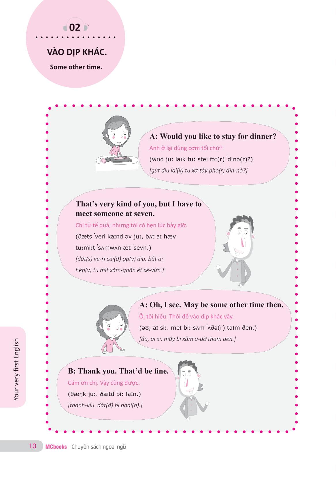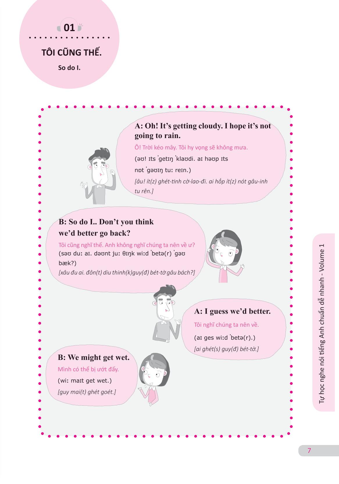 Nội dung cuốn sách được chia theo từng chủ đề thông dụng trong cuộc sống hằng ngày, có phiên âm quốc tế và phiên âm tiếng Việt để các bạn có thể thực hành và ứng dụng được ngay vào các cuộc nói chuyện thực tế. Cuốn sách cũng rất phù hợp làm tài liệu tham khảo giảng dạy cho các thầy cô. Ngoài ra, các bạn cũng tìm thấy cuốn sách này rất hữu ích trong việc phát triển kỹ năng nghe cũng như làm gia tăng vốn từ vựng của mình. Các bạn sẽ hài lòng vì có được nguồn tài liệu phong phú và phù hợp với mình.
