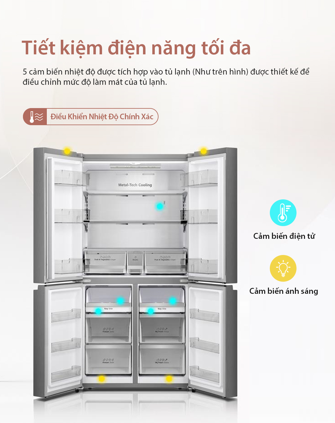 - Điều Khiển Nhiệt Độ Chính Xác: 5 cảm biến nhiệt độ được tích hợp vào tủ lạnh (Như trên hình) được thiết kế để điều chỉnh mức độ làm mát của tủ lạnh.