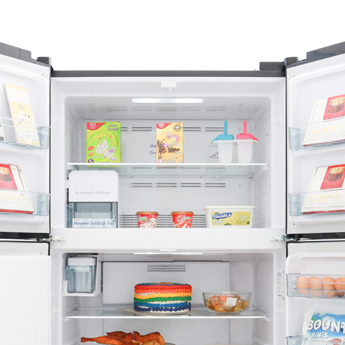 - Hỗ Trợ Suốt Thời Gian Sử Dụng Thiết kế phẳng mạnh mẽ, hiện đại Tủ Lạnh Inverter Hitachi R-FW690PGV7X-GBK được thiết kế theo kiểu side by side, dòng sang trọng với 4 cửa và tích hợp vòi lấy nước ngoài cánh tiện dụng, giúp người dùng dễ dàng thao tác sử dụng kết hợp với gam màu đen tinh tế mang đến vẻ đẹp hiện đại cho không gian nội thất nhà bạn. Hơn nữa, chiếc tủ lạnh Hitachi có dung tích lên đến 540 lít sở hữu không gian lưu trữ vô cùng rộng rãi, phù hợp với những gia đình 5 - 7 người. Công nghệ Inverter với hệ thống quạt kép giúp tiết kiệm điện Tủ lạnh được trang bị công nghệ Inverter tiến tiến, giúp kiểm soát lượng khí đi đến từng ngăn, đảm bảo không có sự lãng phí điện năng và được xếp hạng tiết kiệm điện hàng đầu thế giới. Cùng với hệ thống quạt kép hiện đại giúp làm lạnh độc lập và hiệu quả cho cả hai ngăn (ngăn lạnh và ngăn đá). Hệ thống quạt kép cải tiến mới này sẽ mang đến hiệu quả tiết kiệm điện năng tốt hơn và làm lạnh cực mạnh, hỗ trợ bởi bộ đôi cảm biến nhiệt Eco được trang bị cho từng ngăn, giúp nhận biết sự thay đổi nhiệt độ tại mọi thời điểm. Với khả năng giữ lạnh lâu, có thể giữ không khí lạnh thêm 12 giờ khi bị mất điện và ngay cả khi nhiệt độ của môi trường bên ngoài lên đến 60°C, mọi không gian bên trong tủ lạnh vẫn hoàn toàn mát. Tủ còn hoạt động ổn định với sự dao động điện áp rộng, từ 130V tới 300V. Tính năng Fresh Select Thiết bị được trang bị tính năng Fresh Select thông minh với tính năng này cho phép điều chỉnh nhiệt độ bên trong ngăn dễ dàng bằng cách chuyển đổi giữa hai chế độ sữa/thịt và rau quả: Chế độ trữ rau quả