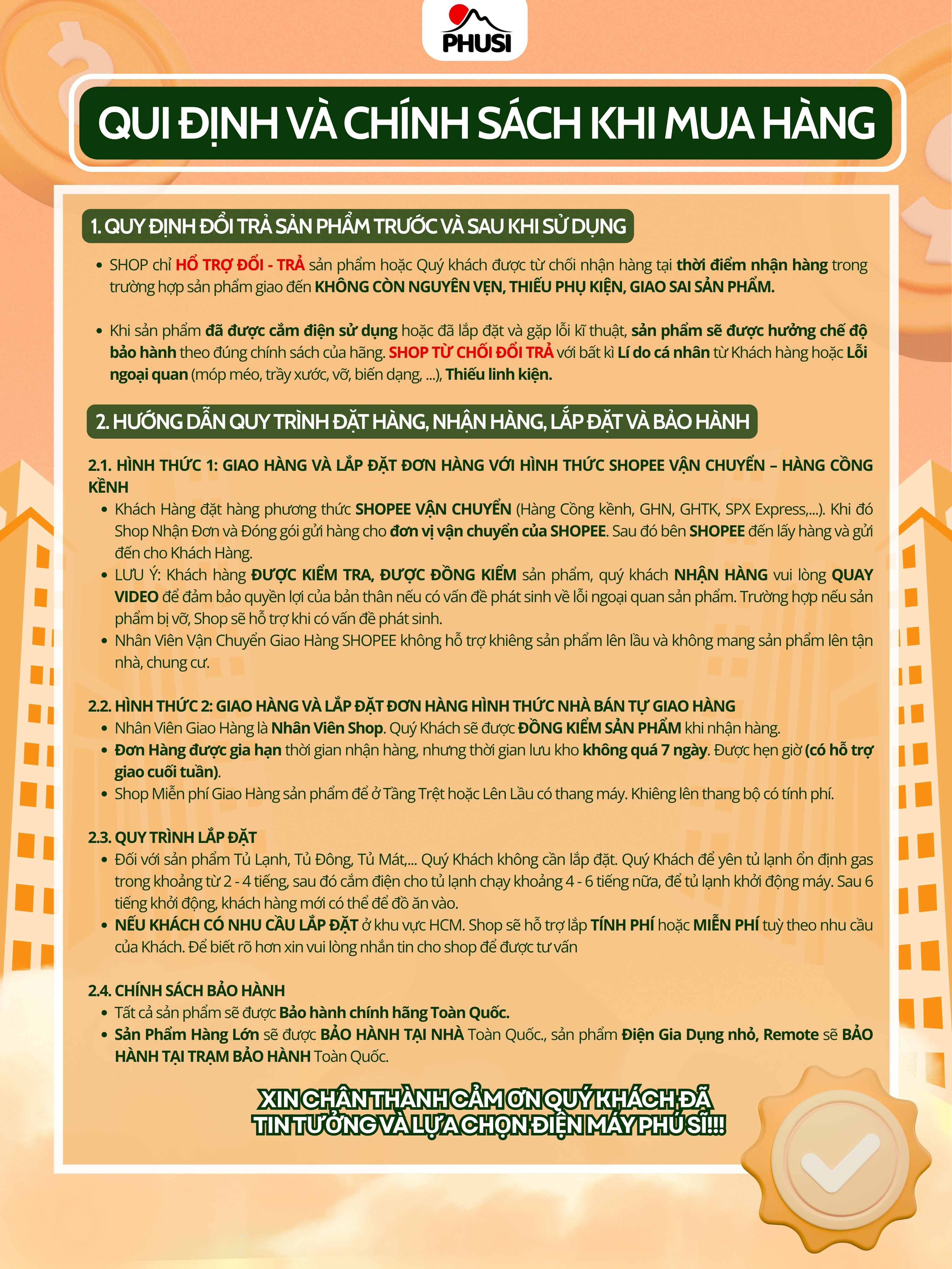 Khu vực ngoại thành HCM có giao hàng tính phí, vui lòng liên hệ trước. - Lắp đặt MIỄN PHÍ ở nhà trệt / có thang máy, lên lầu thang bộ có phí. - Cần