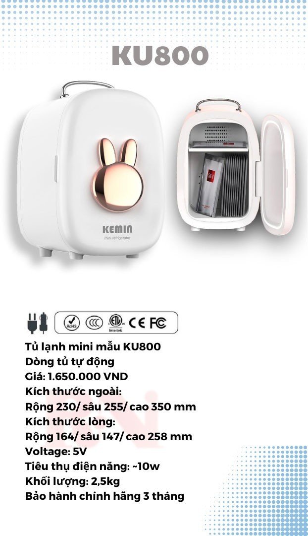 Mua tại TiktokTủ Ku800 dung tích 8L có kích thước 23X25.5X35 cm là dòng tủ tự động, công nghệ mới Chống ngưng tụ hơi nước Làm nóng đến 65 độ C - làm lạnh từ 10 - 15 độ C Sử dụng nguồn điện 5v - tiêu thụ điện năng 10W Phụ kiện đi kèm: Dây nguồn USB-type C ( quý khách cắm vào cục sạc điện thoại là có thể sử dụng ) Lưu ý: Thường xuyên vệ sinh tủ do các đặc tính của tủ sẽ có hiện tượng ngưng tụ hơi nước Siêu phẩm tủ lạnh mini sang - xịn - mịn Vậy tủ mini kemin phù hợp với những đối tượng nào ️