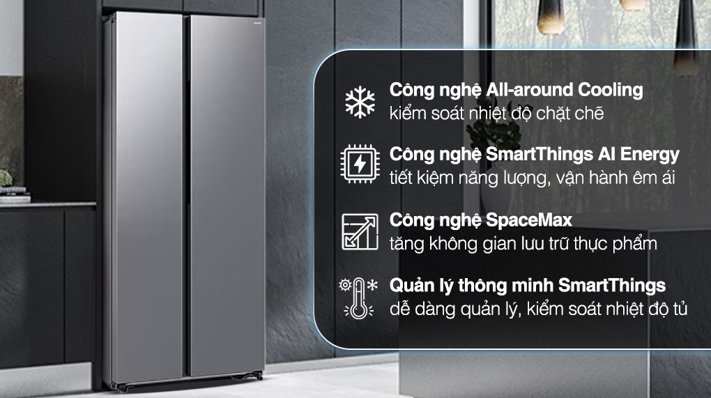 Đặc điểm nổi bật - Thiết kế Side by Side hiện đại với dung tích 655 lít phù hợp cho gia đình trên 5 thành viên. - Công nghệ All-around Cooling giúp kiểm soát nhiệt độ tủ, giữ cho thực