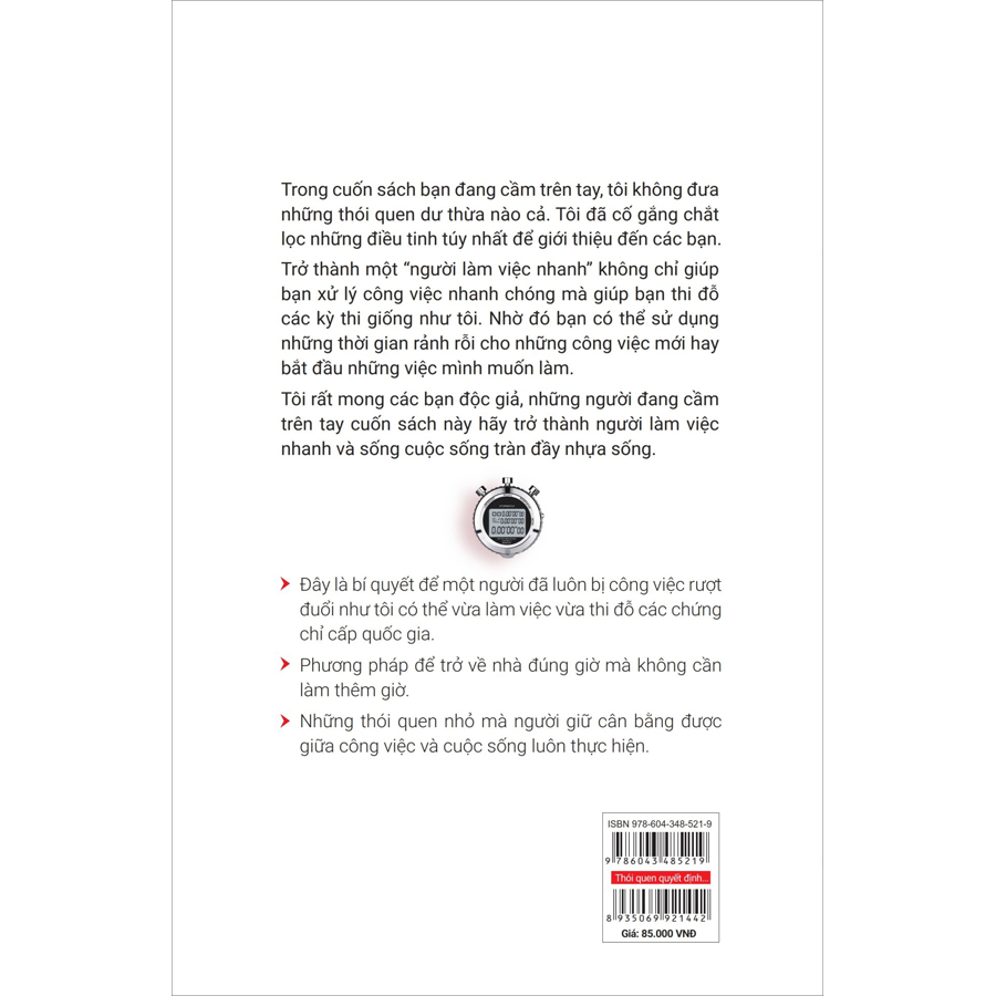 Cuốn sách này không đưa những thói quen dư thừa nào cả mà tac giả cố gắng chắt lọc những điều tinh tuý nhất để giới thiệu đến các độc giả. Trở thành một “người làm việc nhanh” không chỉ giúp bạn xử lý công việc nhanh chóng mà giúp bạn đạt được những kết quả khả quan. Nhờ đó bạn có thể sử dụng những thời gian rảnh rỗi cho những công việc mới hay những bắt đầu những việc mình muốn làm. Tác giả và nhà xuất bản mong rằng các bạn độc giả - những người đang cầm trên tay cuốn sách này hãy trở thành người làm việc nhanh và sống cuộc sống tràn đầy nhựa sống.