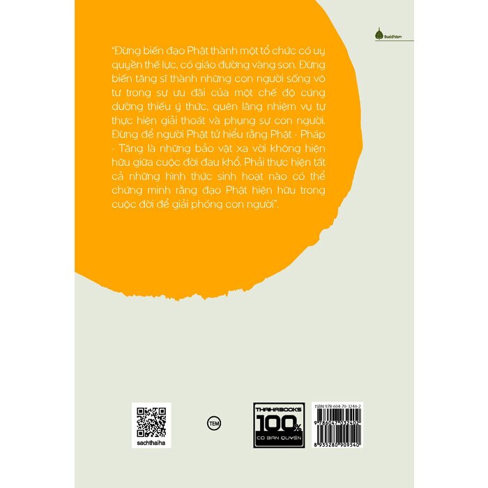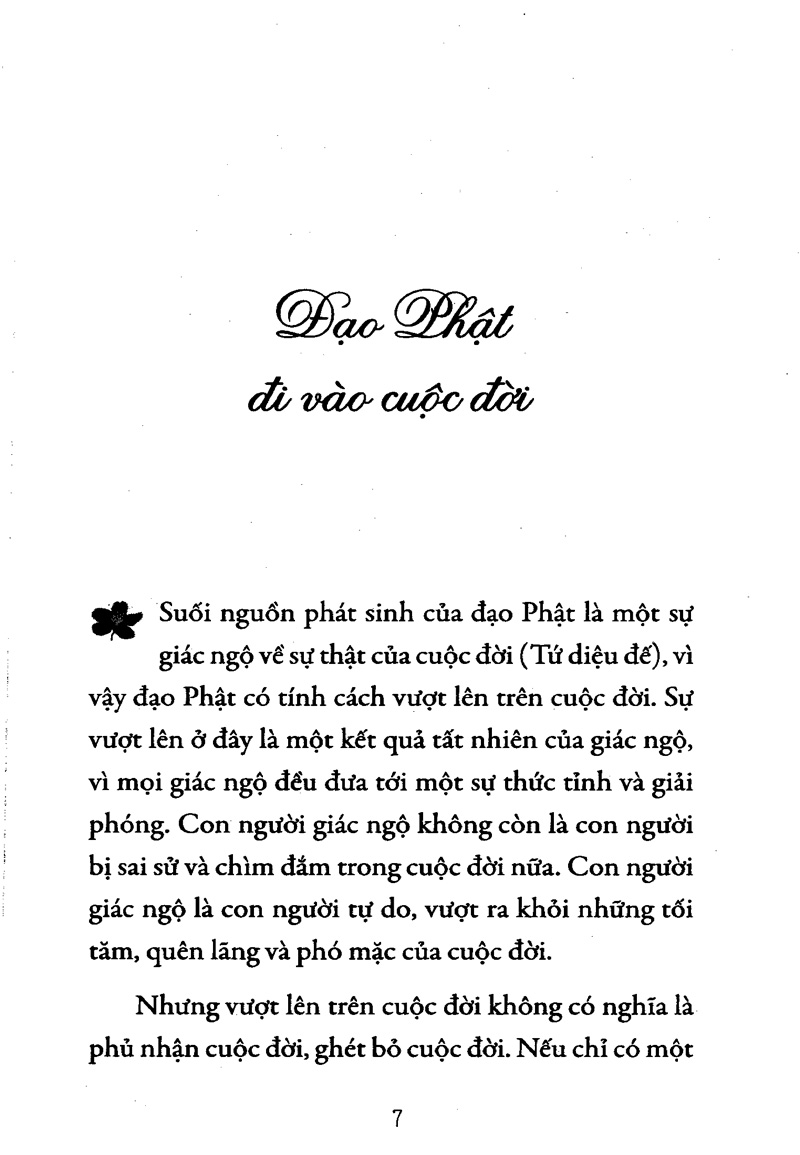 Ngay cái mệnh đề đạo Phật đi vào cuộc đời cũng đã không được ổn thỏa, bởi vì phân tích nó ta sẽ có cảm tưởng đạo Phật là một cái gì đang ở bên ngoài cuộc đời và vì vậy cần phải đem nó đi vào trong cuộc đời. Sự thực thì không phải như vậy. Đạo Phật đã được phát sinh từ trong lòng của cuộc đời, đã được nuôi dưỡng bởi cuộc đời và đang tồn tại vì cuộc đời.