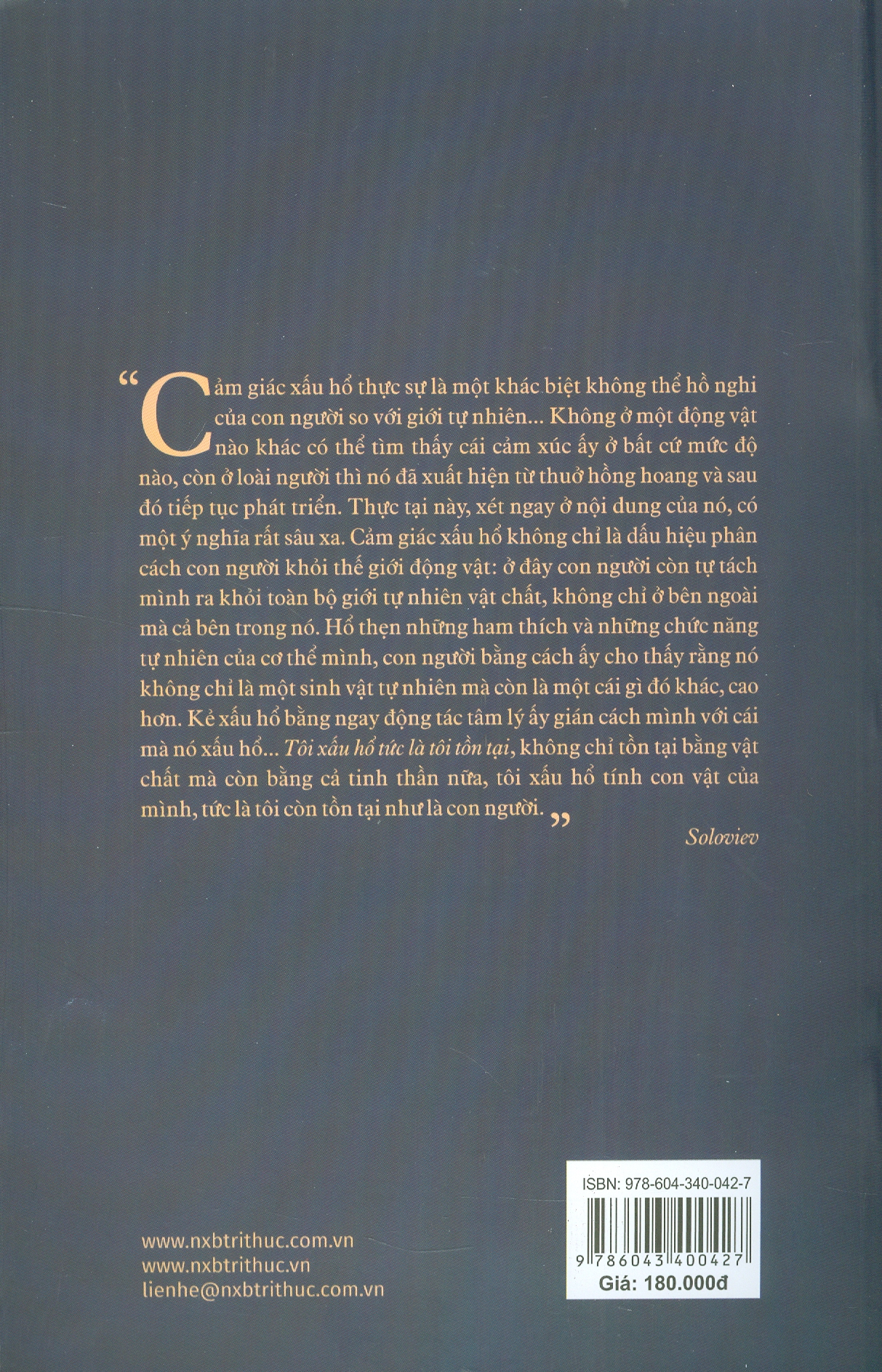 "Cảm giác xấu hổ thực sự là một khác biệt không thể hồ nghi của con người so với giới tự nhiê Không ở một động vật nào khác có thể tìm thấy cái cảm xúc ấy ở bất cứ mức độ nào, còn ở loài người thì nó đã xuất hiện từ thuở hồng hoang và sau đó tiếp tục phát triển. Thực tại này, xét ngay ở nội dung của nó, có một ý nghĩa rất sâu xa. Cảm giác xấu hổ không chỉ là dấu hiệu phân cách chon người khỏi thế giới động vật: ở đây con người còn tự tách mình ra khỏi toàn bộ thế giới tự nhiên vật chất, không chỉ bên ngoài mà cả bên trong nó. Hổ thẹn những ham thích và những chức năng tự nhiên của cơ thể con người, con người bằng cách ấy cho thấy rằng nó không chỉ là một sinh vật tự nhiên mà còn là một cái gì đó khác, cao hơn. Kẻ xấu hổ bằng ngay động tác tâm lý ấy gián cách mình với cái mà nó xấ hổ Tôi xấu hổ tức là tôi tồn tại, không chỉ tồn tại bằng vật chất mà còn bằng cả tinh thần nữa, tôi xấu hổ tính con vật của mình, tức là tôi tồn tại như là con người"."
