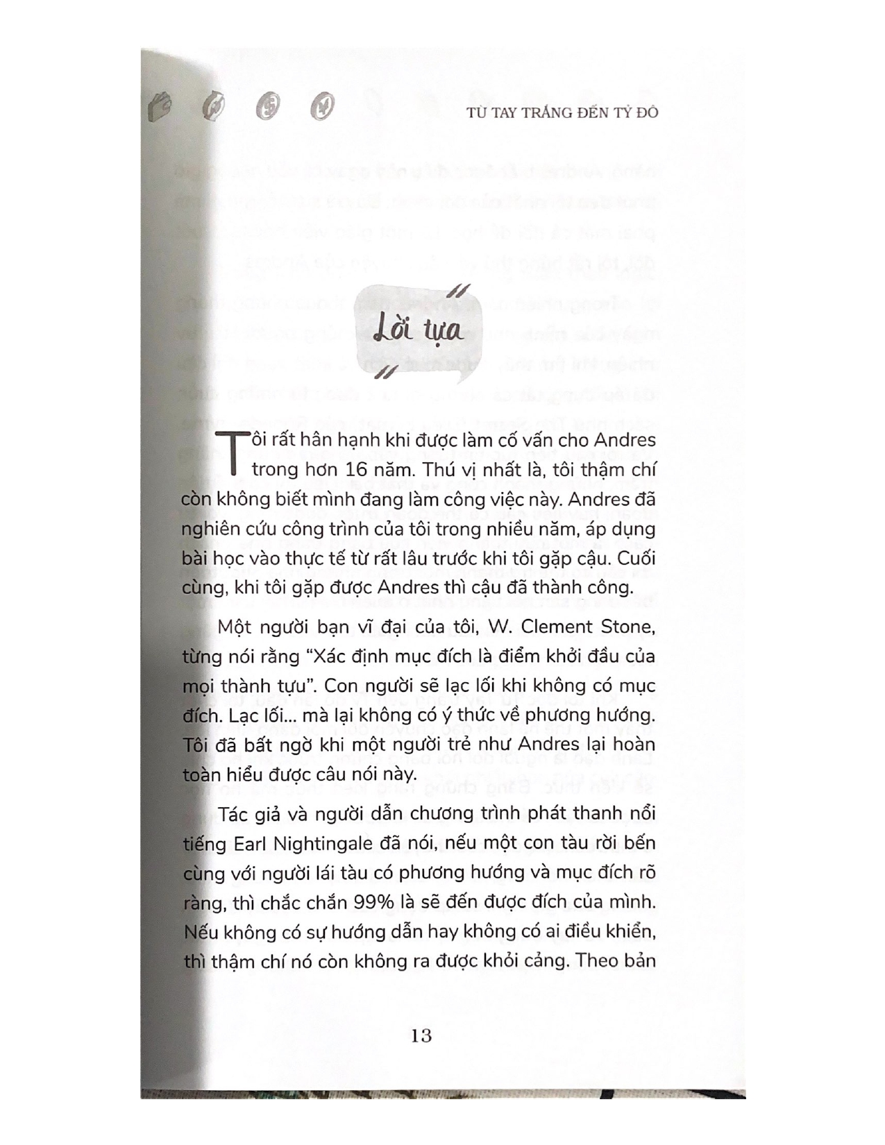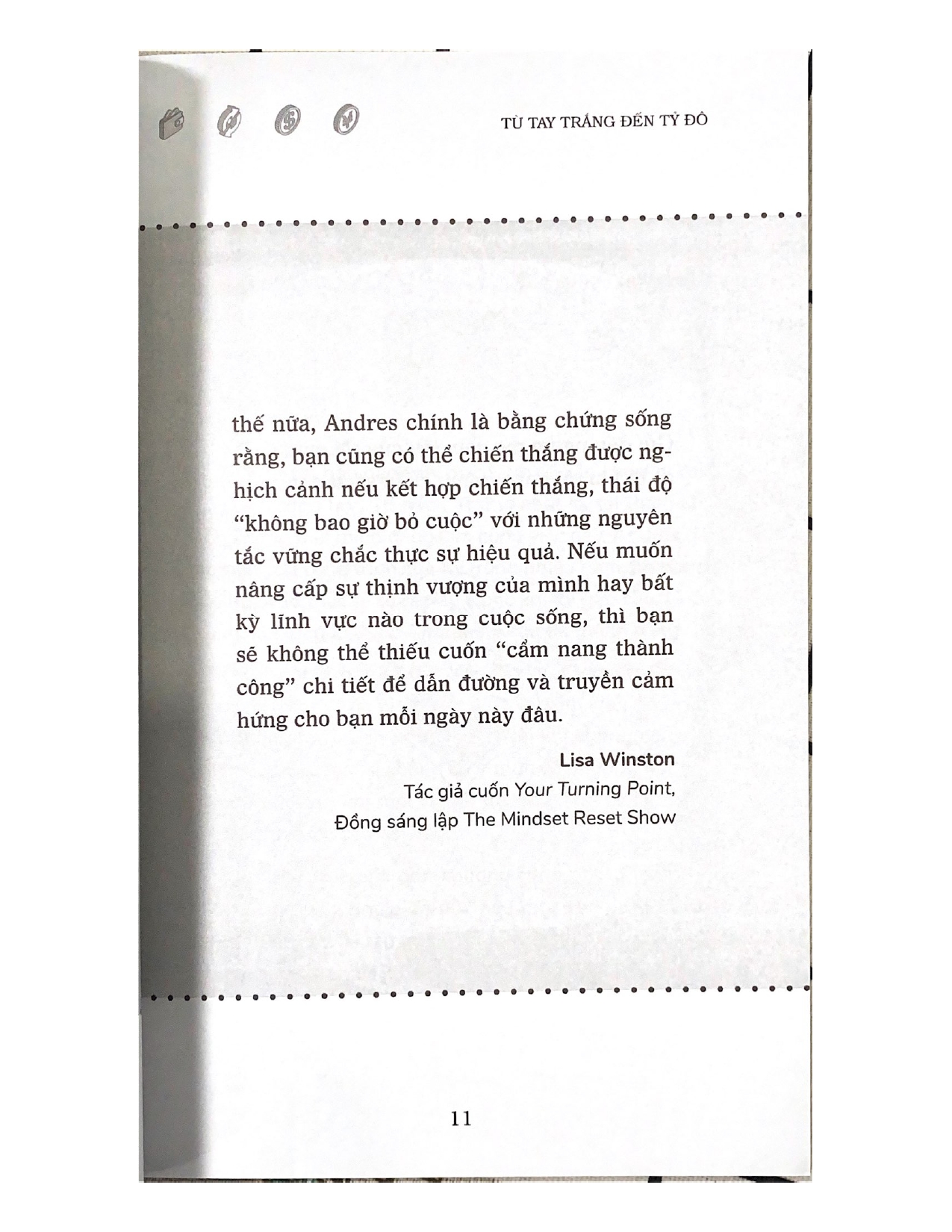 Trong Từ tay trắng đến tỷ đô, Andres Pira trình bày 18 nguyên tắc để thu hút sự giàu có, tạo dựng cơ hội và thực hiện hành trình khám phá bản thân. Lấy cảm hứng từ những thay đổi lớn trong cuộc sống của mình, Pira kể chi tiết hành trình kinh doanh của cậu từ nhân viên tiếp thị qua điện thoại trở thành một trong những tỷ phú nổi tiếng nhất Thái Lan.
