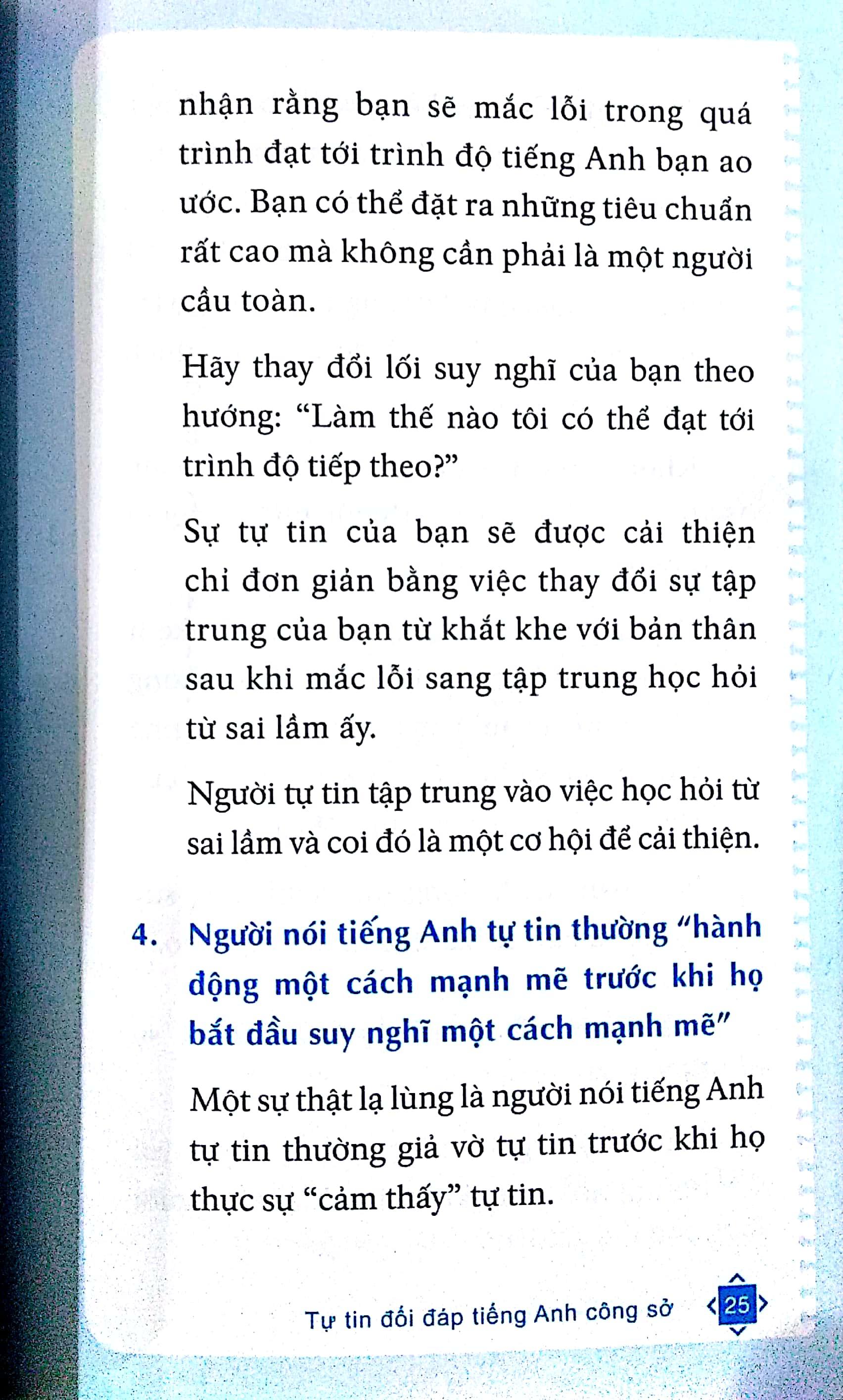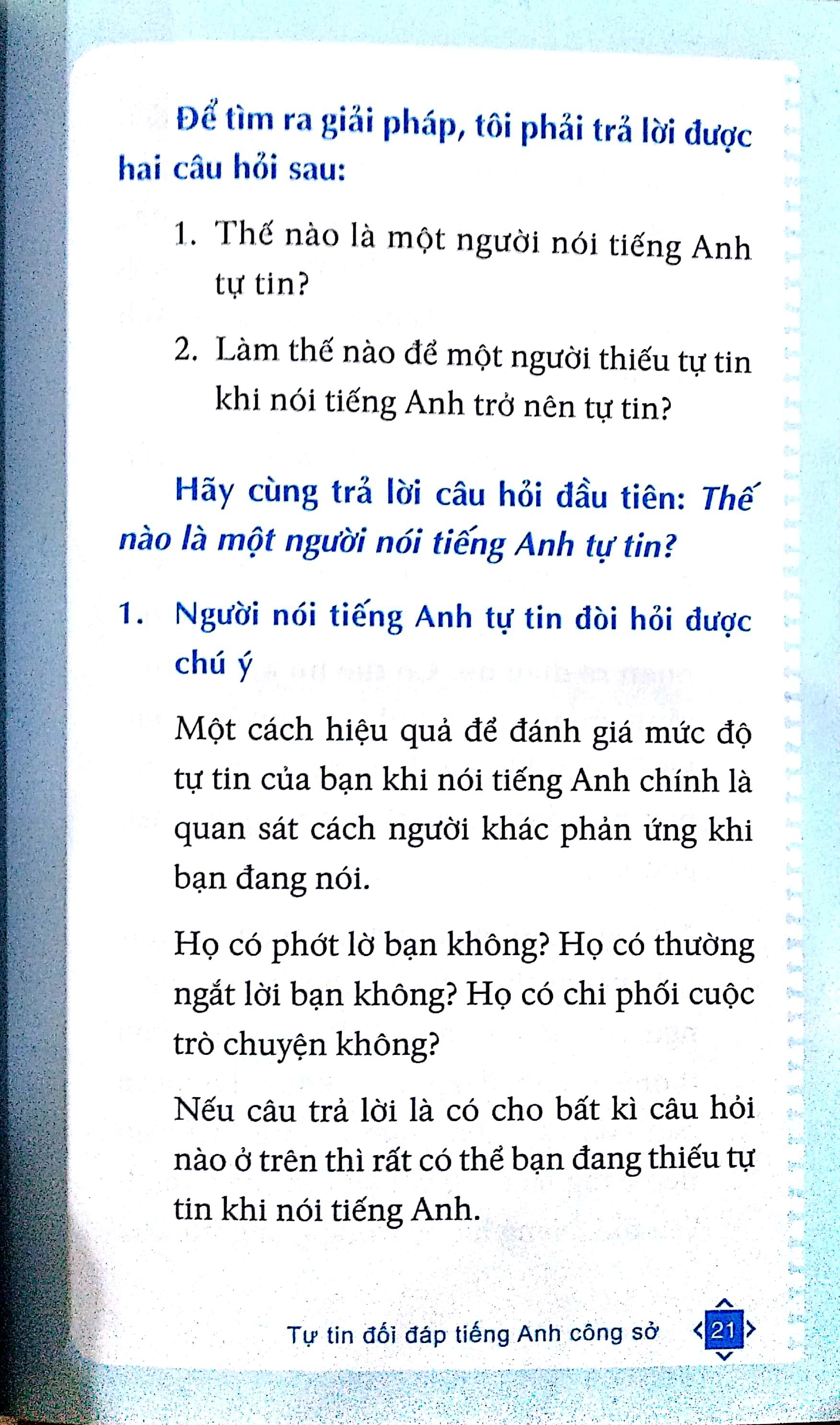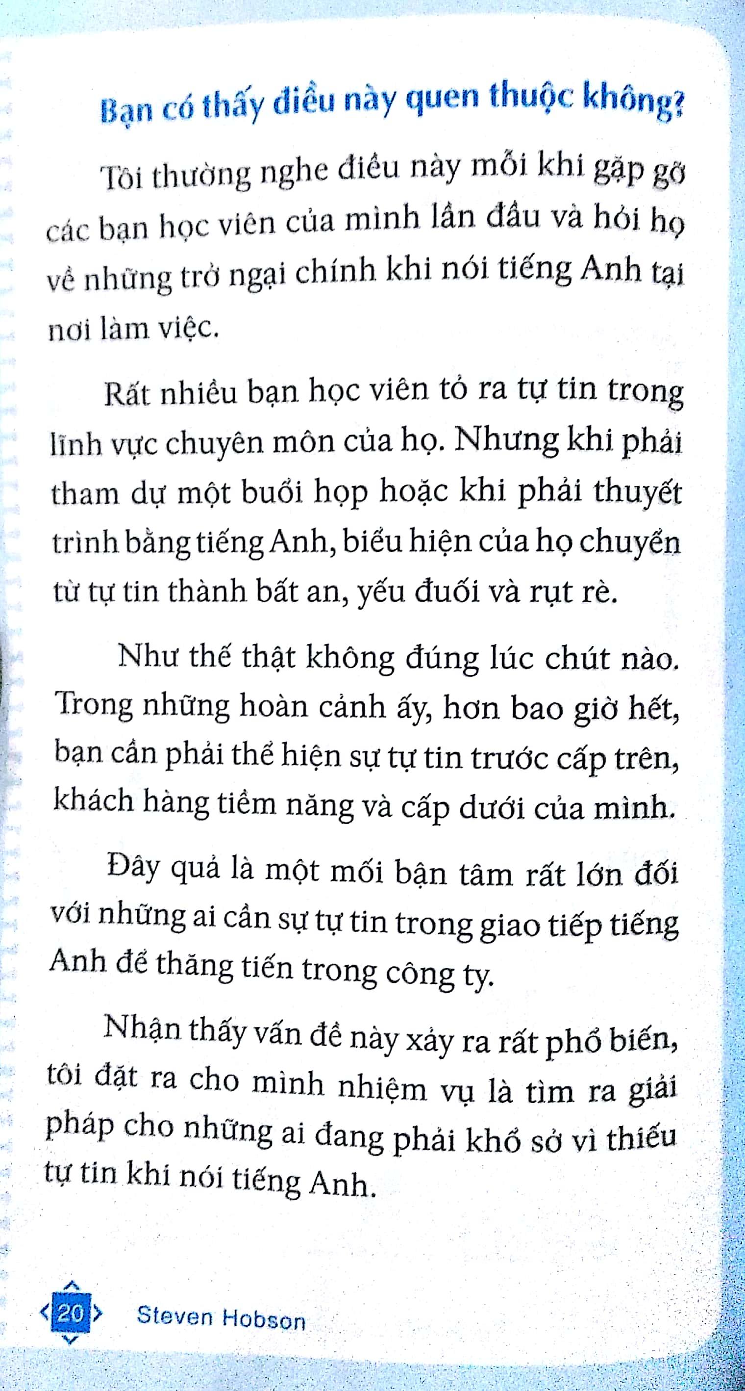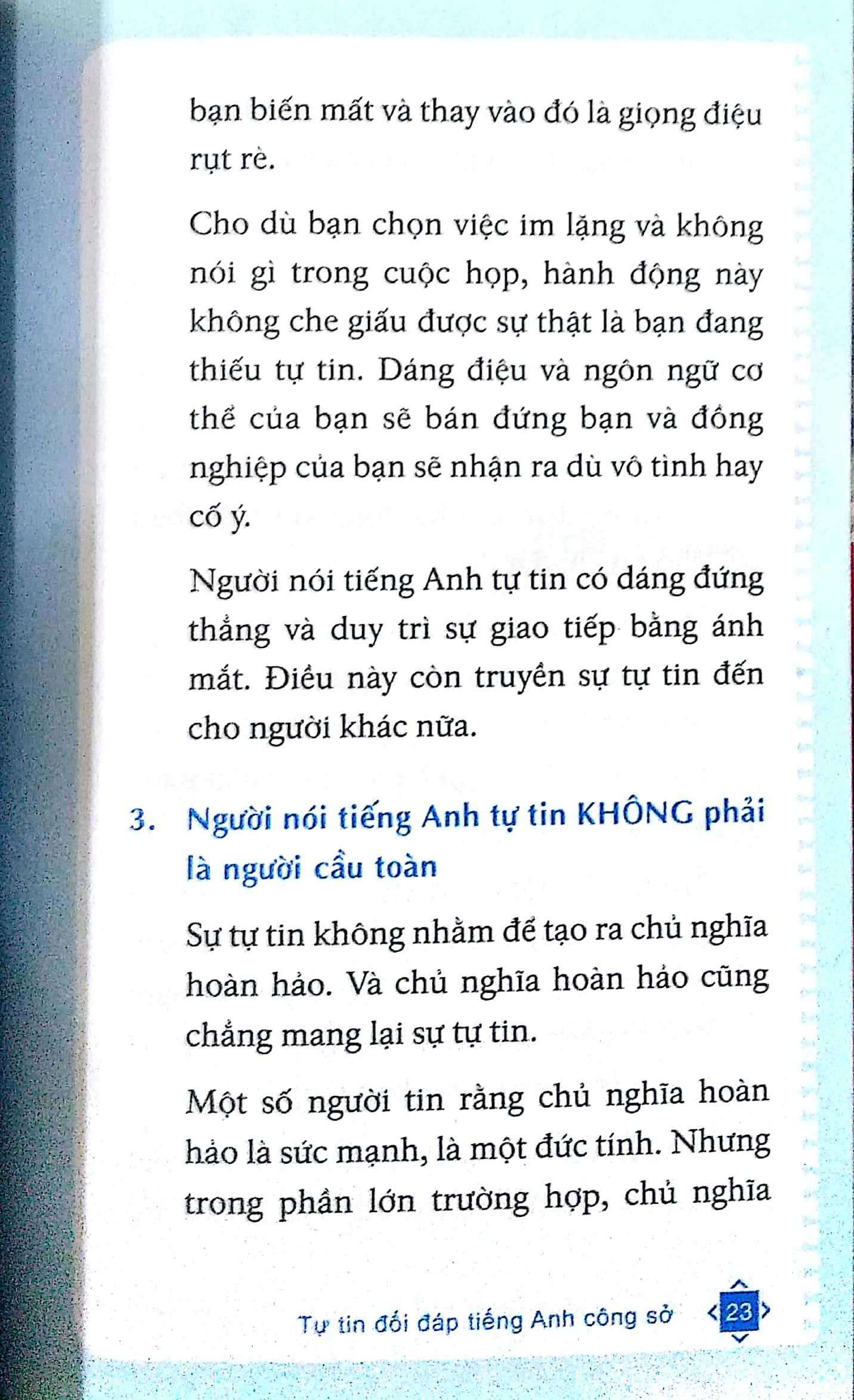 Mua tại TiktokTự tin đối đáp tiếng Anh công sở sẽ giúp bạn nhận thức được sự tự tin quan trọng thế nào với người dùng tiếng Anh như ngôn ngữ thứ hai để giao tiếp. Đồng thời, tác giả Steven Hobson sẽ hướng dẫn từng bước luyện tập cụ thể và thực tế để bạn có được sự tự tin ấy. Dù mục tiêu của bạn là một bài thuyết trình thành công, một buổi phỏng vấn bằng tiếng Anh suôn sẻ hay đơn giản là giao tiếp cởi mở với đồng nghiệp và cấp trên… cuốn sách nhỏ này sẽ giúp bạn thực hiện được tất cả những mục tiêu đó.