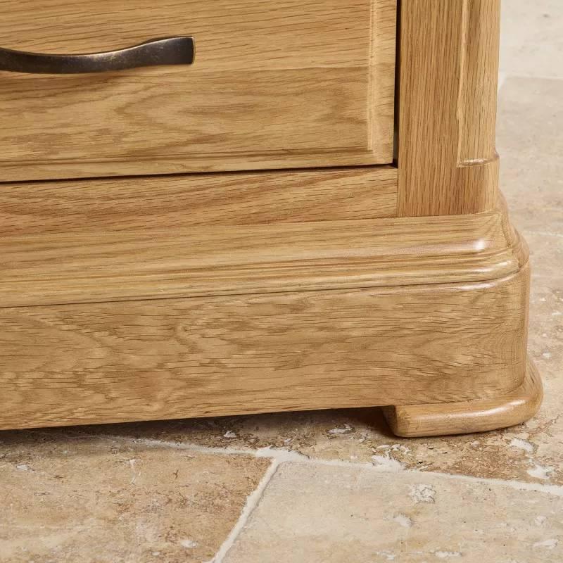 Tủ trưng bày 2 cánh kính Canterbury được làm từ gỗ sồi trắng Mỹ nhập khẩu, mang vẻ ngoài tuyệt đẹp, rất phù hợp cho không gian phòng khách của gia đình. Toàn bộ bề mặt tủ được sơn PU cao cấp giúp bảo vệ lớp gỗ bên trong và vẻ đẹp tự nhiên của các vân gỗ. Thiết kế ngăn tủ kính chắc chắn, với các mặt kệ vững chãi, chịu được trọng lượng lớn, giúp trưng bày các đồ dùng trong nhà thêm phần sang trọng. Hai ngăn kéo rộng rãi, được làm thủ công kết cấu ghép mộng cực kì chính xác, đáp ứng lượng lưu trữ tuyệt vời. Sản phẩm mang đặc trưng của bộ sưu tập Canterbury truyền thống, với những chi tiết cắt góc cạnh bo tròn mềm mại, cạnh nóc và chân loe tinh tế. Mặt ngăn kéo giật cấp cổ điển, kết hợp tay cầm kim loại tối màu tạo nên một tổng thể thanh lịch và hiện đại.