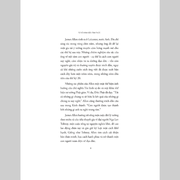 As a man thinketh – Từ vô minh đến tỉnh thức là tuyển tập những tác phẩm nổi tiếng nhất của triết gia thiên tài người Anh – James Allen. Cuốn sách này là những dòng suy ngẫm của tác giả về bản chất con người, với tư cách là một cá thể độc lập cũng như một thành viên của xã hội. Thế giới bên ngoài, rực rỡ, đẹp đẽ hay tăm tối xấu xa, hoàn toàn phụ thuộc vào cách ta nuôi dưỡng thế giới nội tâm của mình. Trong hành trình vun xới cho khu vườn tâm trí ấy, liệu ta có biếng lười mà thả mình theo những cám dỗ ngọt ngào hiểm ác, hay sẽ can đảm lựa chọn một con đường dẫu gian lao nhưng lương thiện, trong sáng và được ban phước lành?