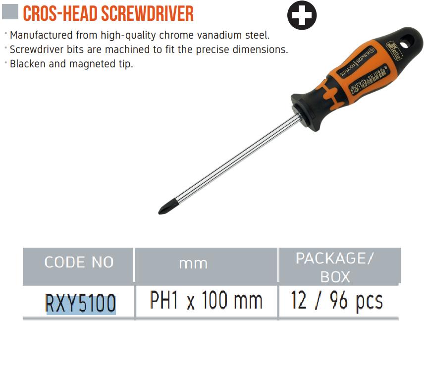 Tua vít 4 cạnh PH1 x 100mm Retta RXY5100 Thổ Nhĩ Kỳ Model:RXY5100 Chiều dài:100mm Là dụng cụ cầm tay, chuyên dùng để vặn, siết đóng ốc vít bằng tay. Sản phẩm được gia công rất tỉ mỉ, đã qua kiểm định nghiêm ngặt, đáp ứng được những yêu cầu về kỹ thuật, chất lượng, đảm bảo sự an toàn cho người dùng