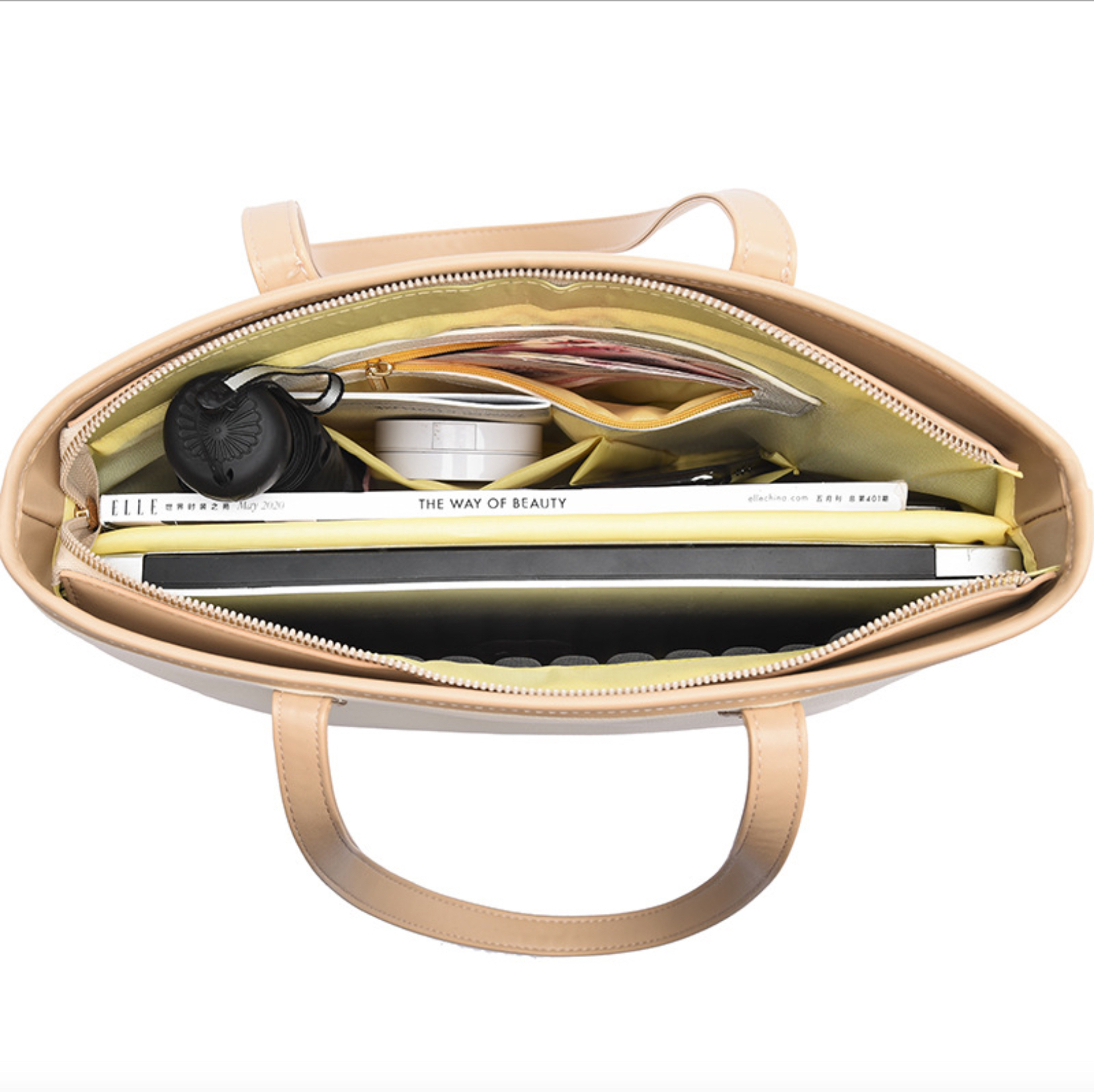 Thiết kế thanh lịch, hiện đại kiểu dáng gọn gàng, tối giản, dễ phối với nhiều phong cách từ công sở đến hàng ngày Ngăn phụ tiện lợi cho sạc, điện thoại, sổ tay, phụ