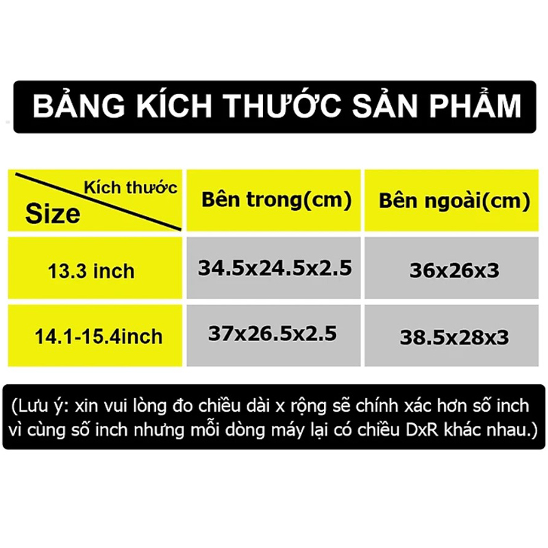 Lưu ý quan trọng : Anh/chị vui lòng không chọn size túi theo kích thước (inch) của màn hình laptop, vì mỗi laptop tuy có kích thước (inch) màn hình bằng nhau nhưng kích thước thực tế (gồm dài x rộng x dày) sẽ không giống nhau. Nên Shop có ghi chú kích thước bên trong và bên ngoài của từng size túi, mong anh/chị hãy xem và chọn size túi theo kích thước thực tế của laptop.