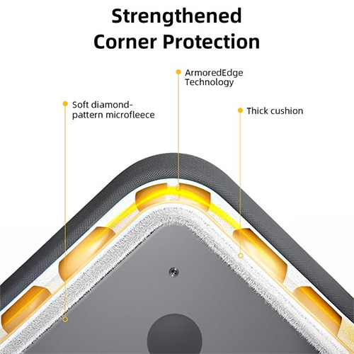 - Sử dụng công nghệ sáng chế tiên tiến của Hoa Kỳ CornerArmor trang bị phía dưới túi chống sốc một lớp đệm bảo vệ 360* xung quanh vành túi một cách an toàn như