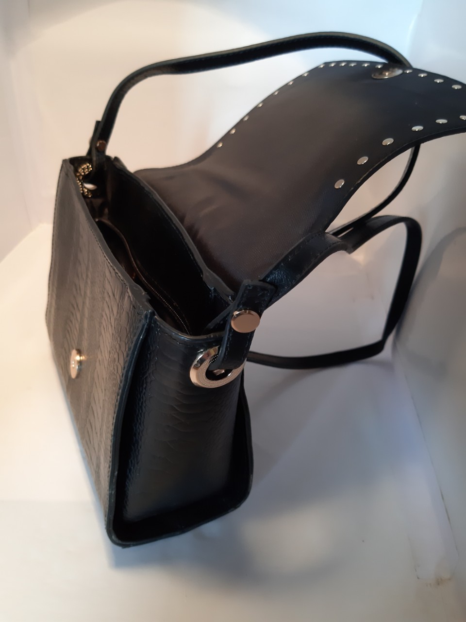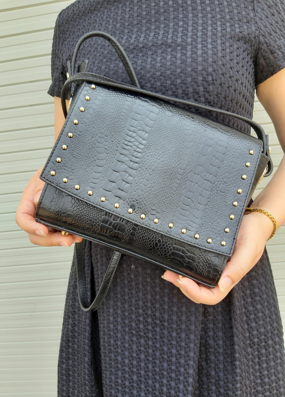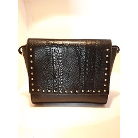 Túi được thiết kế dáng nắp gập có trang trí hàng đinh tròn xung quanh tạo điểm nhấn khá ấn tượng , bên trong có khóa kéo kín miệng túi, 2 ngăn mở + 1 ngăn khóa giúp bạn gái cất giữ được những vật dụng cần thiết khi mang theo bên mình.