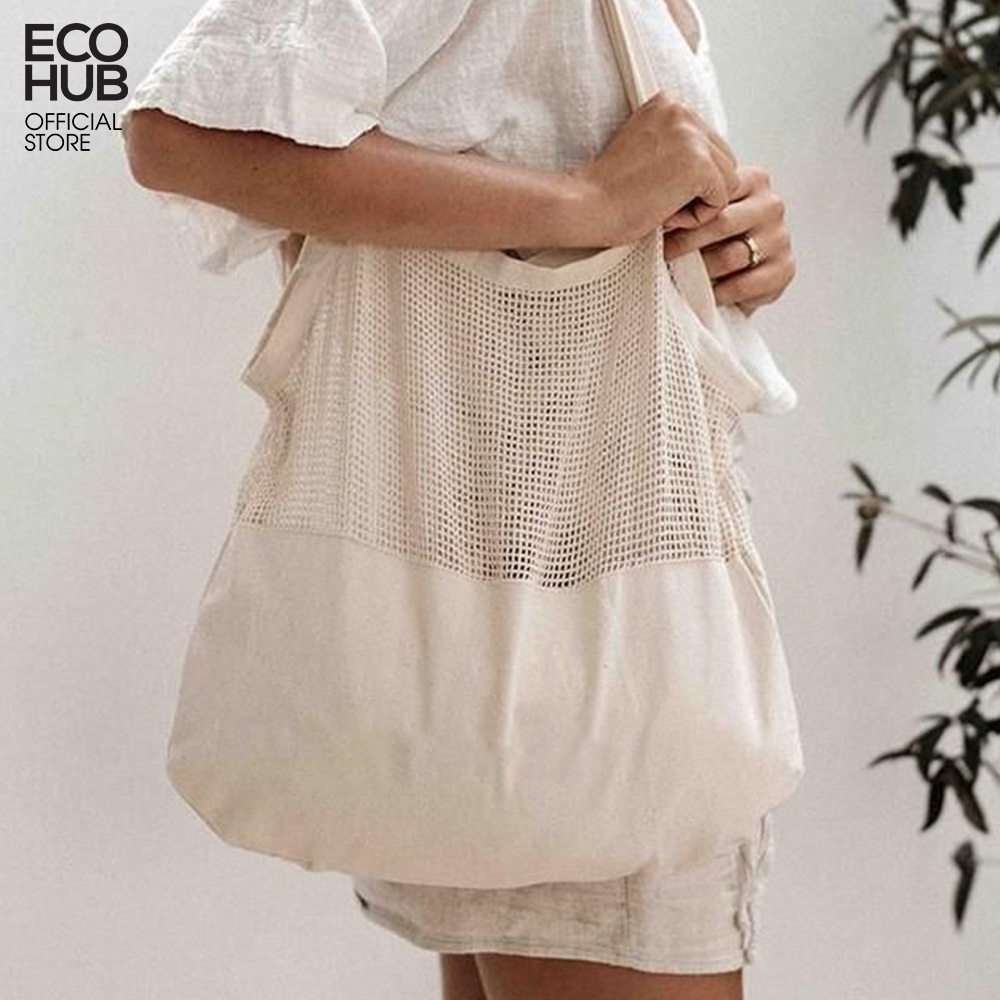✨Túi đeo vai ECOHUB bằng vải phong cách màu be thích hợp đi chợ, mua sắm, dạo chơi trên đường phố
