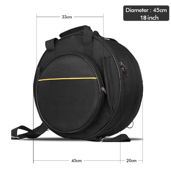 - Thiết kế đa năng, có tay cầm trên đầu và dây đai vai có thể điều chỉnh để mang theo thuận tiện. 4.Bảo vệ trống của bạn khi di chuyển hoặc tránh xa bụi khi không sử dụng. 5.Có lớp đệm với lớp lót mềm chống sốc, chống xây xát. Thông số kỹ thuật: Màu sắc : Màu đen Vải: Vải Oxfoard chống thấm Chất liệu bên trong: Bọt biển, vải lót Kích thước: 18 inch - Đựng vừa trống snare 14inch Đường kính: 45 cm Lưu ý: 1 inch≈2,54cm