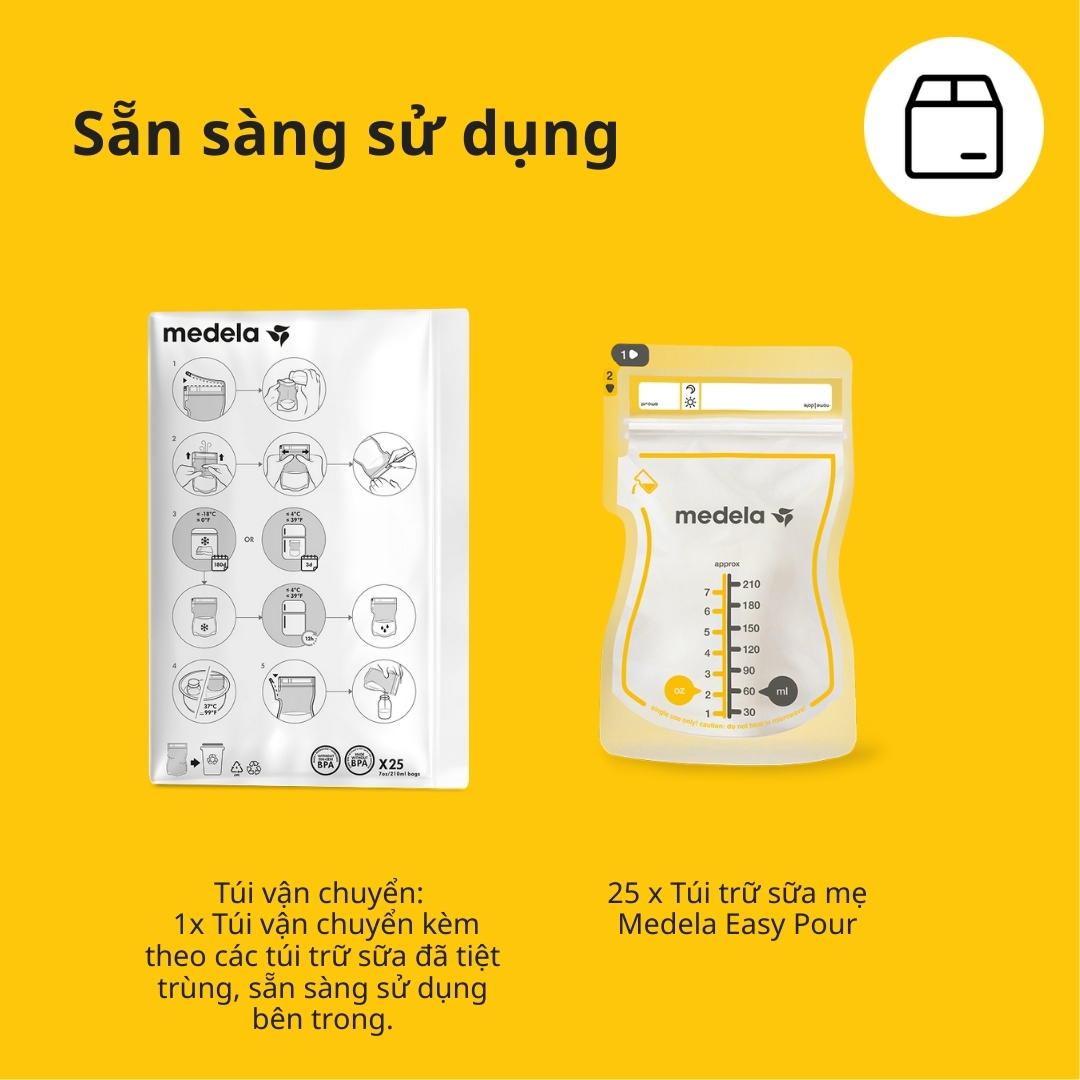 Mua tại Tiktok【TÚI TRỮ SỮA MEDELA EASY POUR】 Dùng túi trữ sữa Easy Pour để bảo quản sữa mẹ vừa vắt trong tủ lạnh hoặc tủ đông. Thiết kế miệng túi độc quyền giúp rót sữa dễ dàng, hạn chế tràn đổ hay nhiễm khuẩn chéo. 【Đặc điểm nổi bật】 Rót sữa bằng một tay thật dễ dàng – 85% mẹ đồng ý: Thiết kế miệng túi độc quyền giúp hạn chế tràn sữa và tránh lây nhiễm chéo. Bảo vệ dưỡng chất trong sữa mẹ với chất liệu dày dặn đặc biệt. Hoàn toàn không rò rỉ – 98% mẹ đồng ý Tiết kiệm không gian bảo quản: Thiết kế có thể đặt nằm phẳng hoặc đứng vững trong tủ lạnh/tủ đông – 76% mẹ đồng ý Thân thiện môi trường: Có thể tái chế, làm từ một loại vật liệu duy nhất, không cần rửa trước khi bỏ. Sẵn sàng sử dụng: Đã được tiệt trùng và đóng gói trong túi vận chuyển. Dễ dàng sắp xếp: Có vạch chia thể tích rõ ràng và chỗ ghi ngày giờ lượng sữa. Không chứa BPA – an toàn cho mẹ và bé. Khảo sát người tiêu dùng được thực hiện bởi đơn vị độc lập vào tháng 11 năm 2023 【Phân loại đóng gói】 Có thể lựa chọn giữa 2 phân loại: 25pcs/ hộp hoặc 50pcs/ hộp 【Dung tích】 Dung tích của túi trữ sữa Medela Easy Pour là 210ml (7oz) Xuất xứ : Trung Quốc Thương hiệu Medela Bao bì sản phẩm có thể thay đổi tùy từng lần nhập hàng.