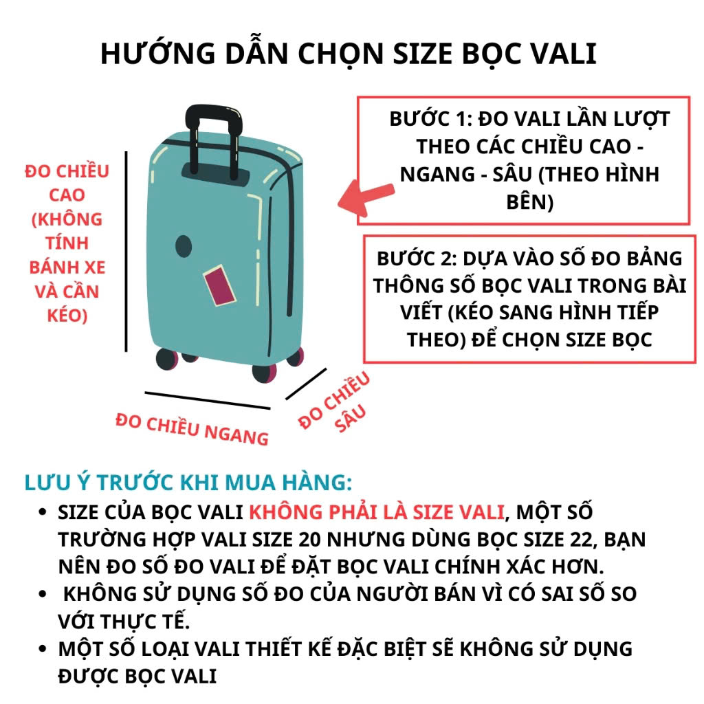 1. HƯỚNG DẪN CHỌN SIZE :Túi bọc bảo vệ vali -Áo vỏ bọc vali Size S : Cao 48-53cm, Dài 32-35 cm, Rộng 20-23cm (18-20 inch ) Size M : Cao 58-63 cm, Dài 39-42