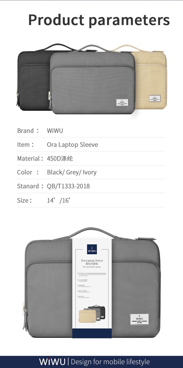 Túi Wiwu Ora Laptop Sleeve Thương hiệu: Mô tả sản phẩm - Kích thước: 14inch, 16inch - Lớp lót dày, êm giúp chống sốc, xước và tránh va đập cho laptop, thuận lợi di chuyển