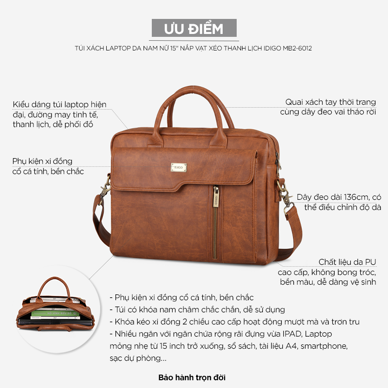 Túi xách Laptop da nam nữ 15" nắp vạt xéo thanh lịch IDIGO MB2-6012-00 sẽ giúp bạn: