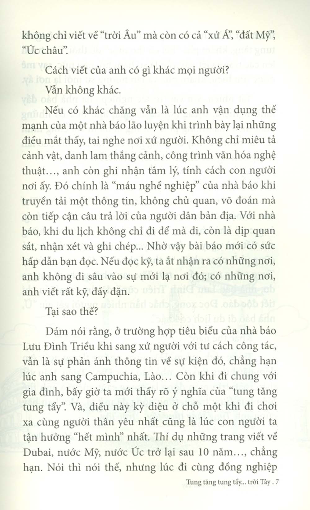 Mua tại TiktokTập bút ký "Tung tăng tung tẩ trời Tây" của nhà báo Lưu Đình Triều không chỉ miêu tả cảnh vật, danh lam thắng cảnh, công trình văn hóa nghệ thuậ anh còn ghi nhận tâm lý, tính cách của con người nơi ấy. Đó chính là "máu nghề nghiệp" của nhà báo khi truyền tải một thông tin, không chủ quan, võ đoán mà còn tiếp cận câu trả lời của người dân bản địa. Với nhà báo, khi du lịch không chỉ đi để đi, mà còn là dịp quan sát, nhận xét và ghi ché