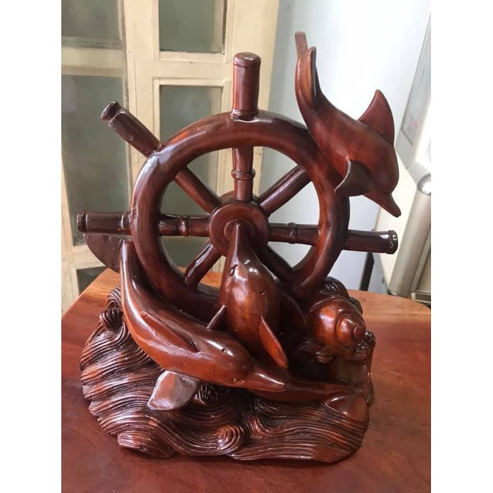 ✨Tượng Gỗ Mỹ Nghệ Chạm 3 Con Cá Heo Gỗ Gõ vui lượn trên bánh vô lăng Size Cao 30cm Ngang 30cm Sâu 12cm Ý nghĩa cá heo tượng trưng cho sự may mắn điềm lành tốt Anh Chị trưng bày trang trí đẹp ạ