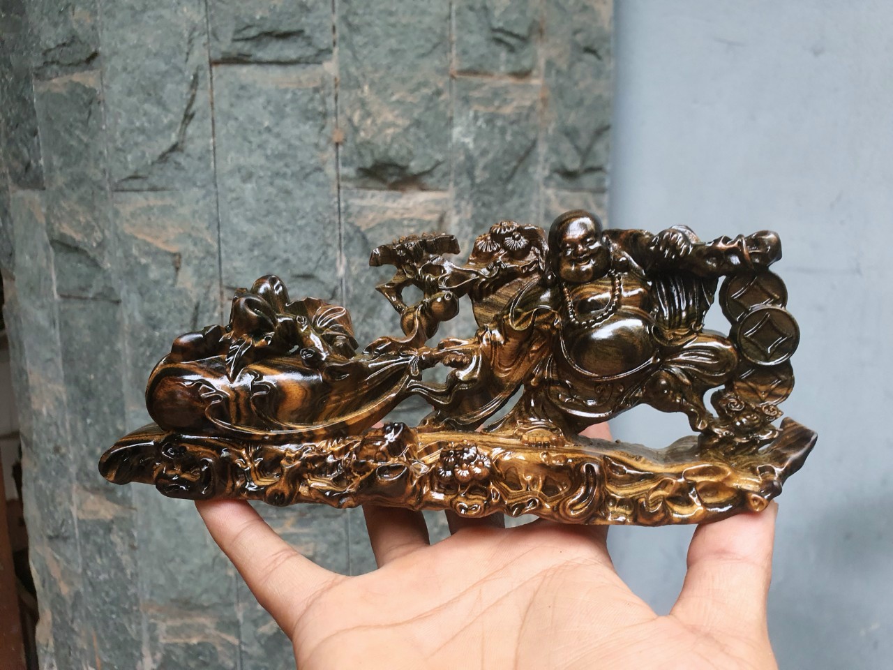 Mua tại TiktokTượng phật di lặc kéo bao tiền được làm bằng chất liệu gỗ mun hoa liền khối tự nhiên 100% Kt 20×8×6cm _ Tượng phật di lặc kéo bao tiền được trạm khắc vô cùng tỉ mỉ ,tinh sảo kỳ công .Đi hầu hết tất cả mọi chi tiết góc ngách nội dung hoa văn của tượng đều được gọt tỉa chỉnh sửa hoàn toàn bằng tay thủ công .Đồng thời tượng được kiểm định kỹ lưỡng ,khắt khe ,như cho vào thẩm sấy cho gỗ khô kiệt .Mục đích trống dập nứt vênh mo mối mọt ,kết hợp với trà nhám ,đánh giấy giáp nhiều nước ,sờ mát lạnh .Rồi cho vào phun lót làm ,bóng mờ để giữ lại mầu sắc vân gỗ tự nhiên ,Tượng được làm vả hoàn thiện do bàn tay khối óc tài hoa .Từ những người thợ giàu kinh nghiệm ,Cũng như tay nghề cao trong làng nghề truyền thống