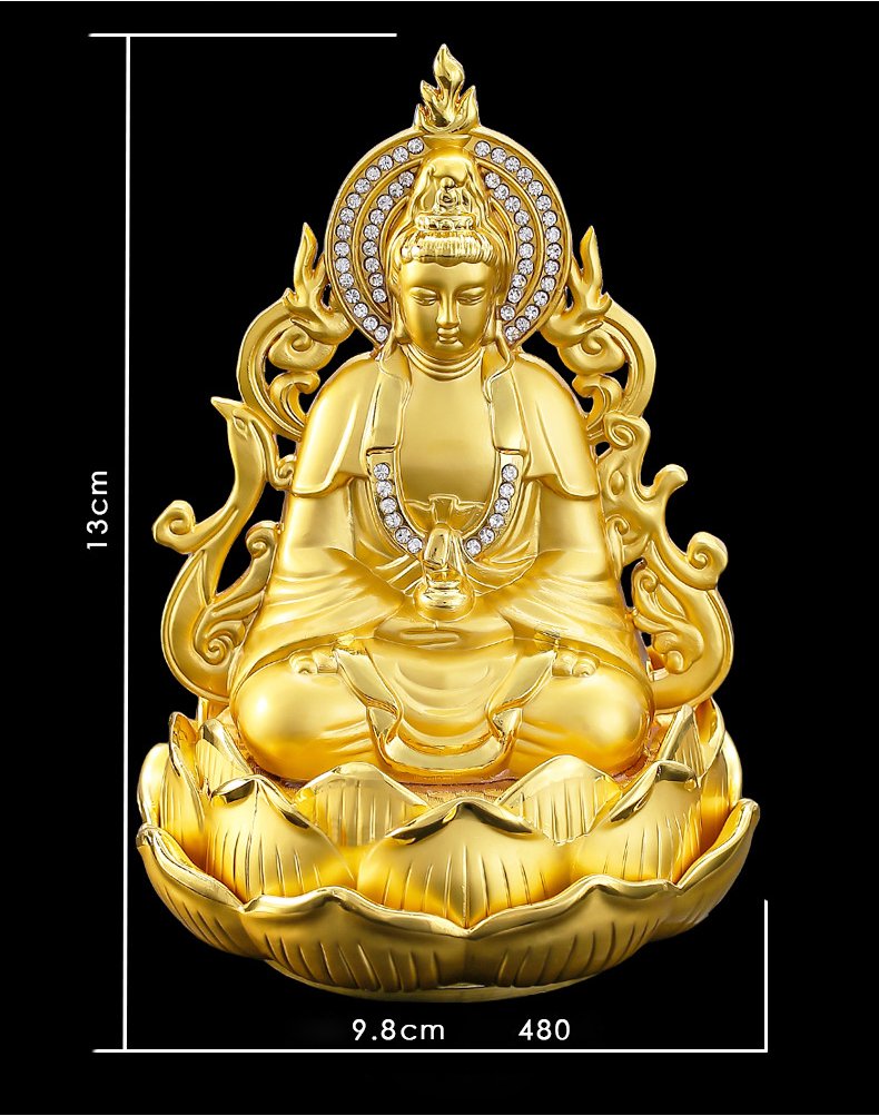 Tượng phật bà quan âm hai mặt tọa đài sen màu vàng đính đá cao cấp trang trí xe hơi, có nước hoa